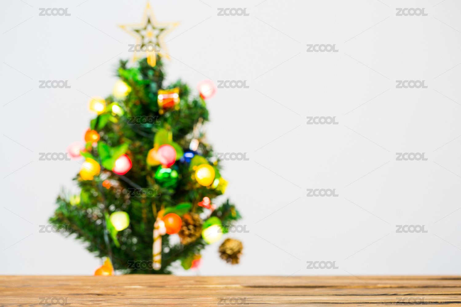 圣诞节背景。 对焦点在圣诞树前的木桌。 选择性的焦点