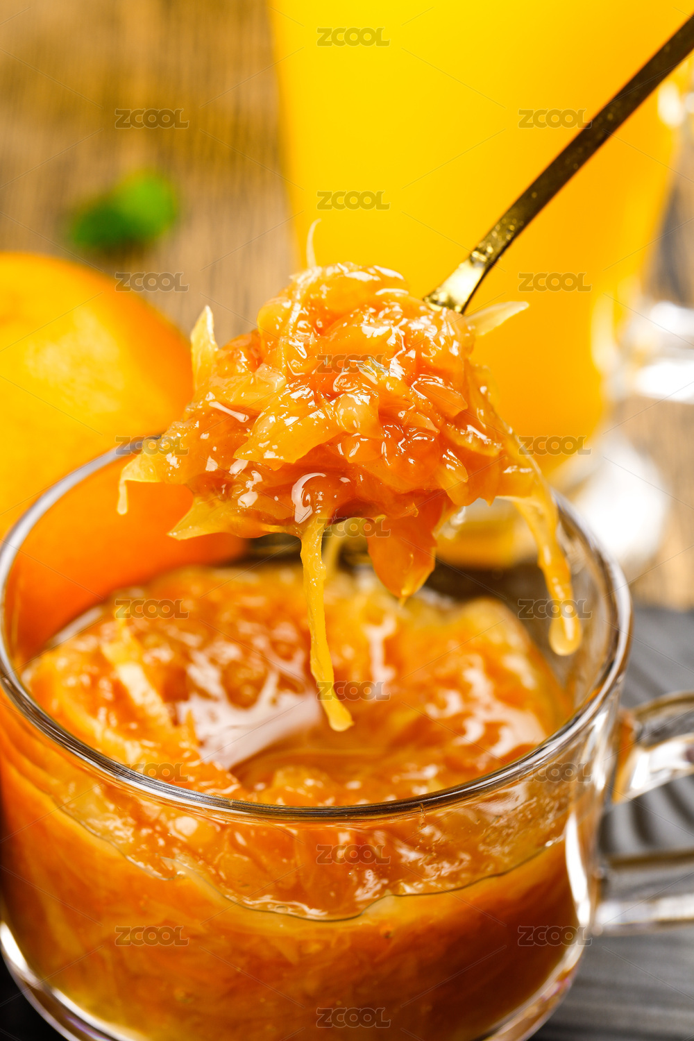 黑底上放着一杯蜂蜜橙子茶和勺子上挖着橙子
