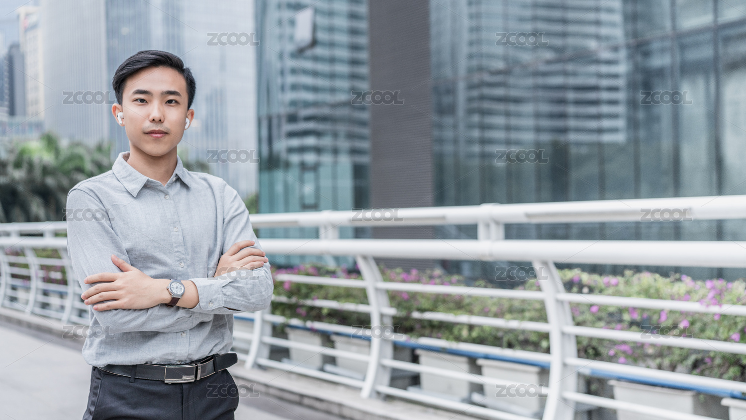 自信的商务人士双手环抱站在天桥上