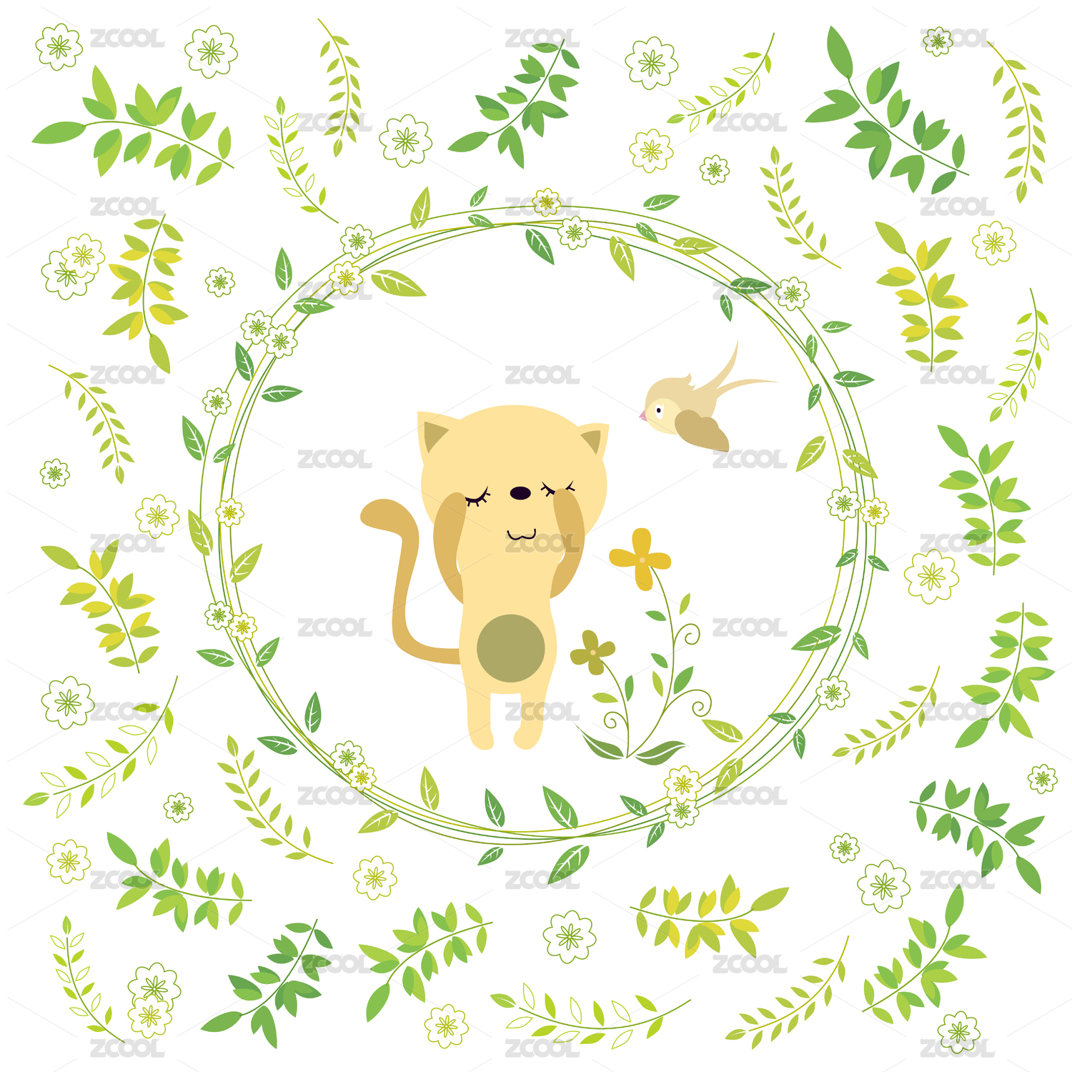 春季绿色卡通动物与植物花环背景