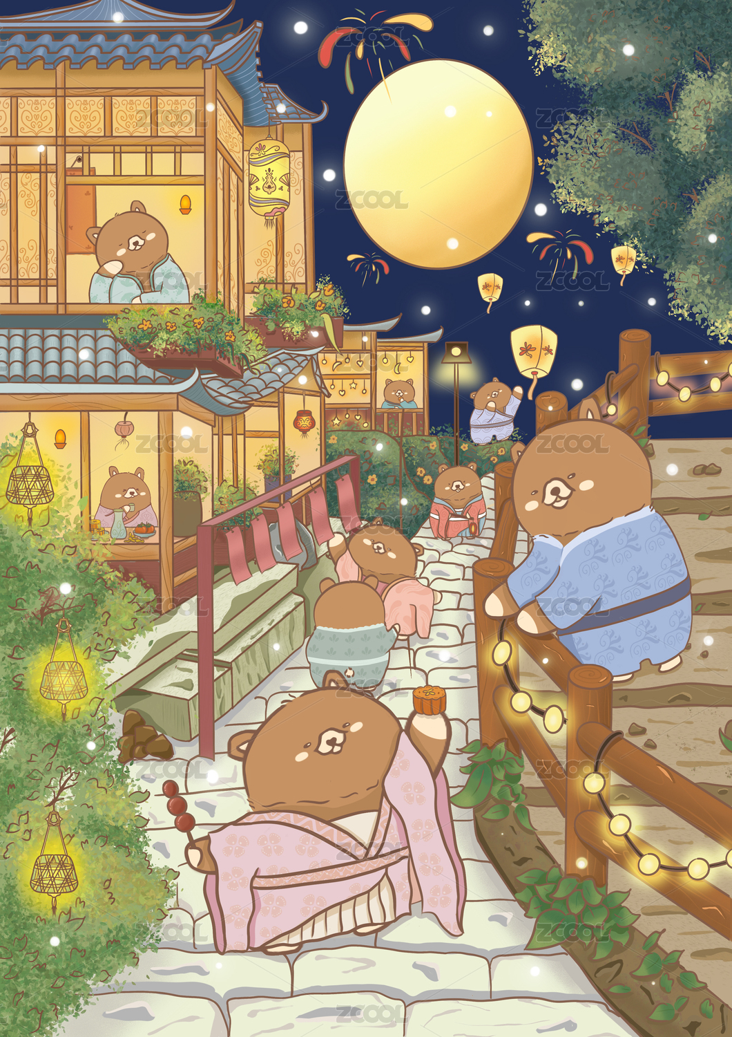 卡通动物熊中秋肌理插画