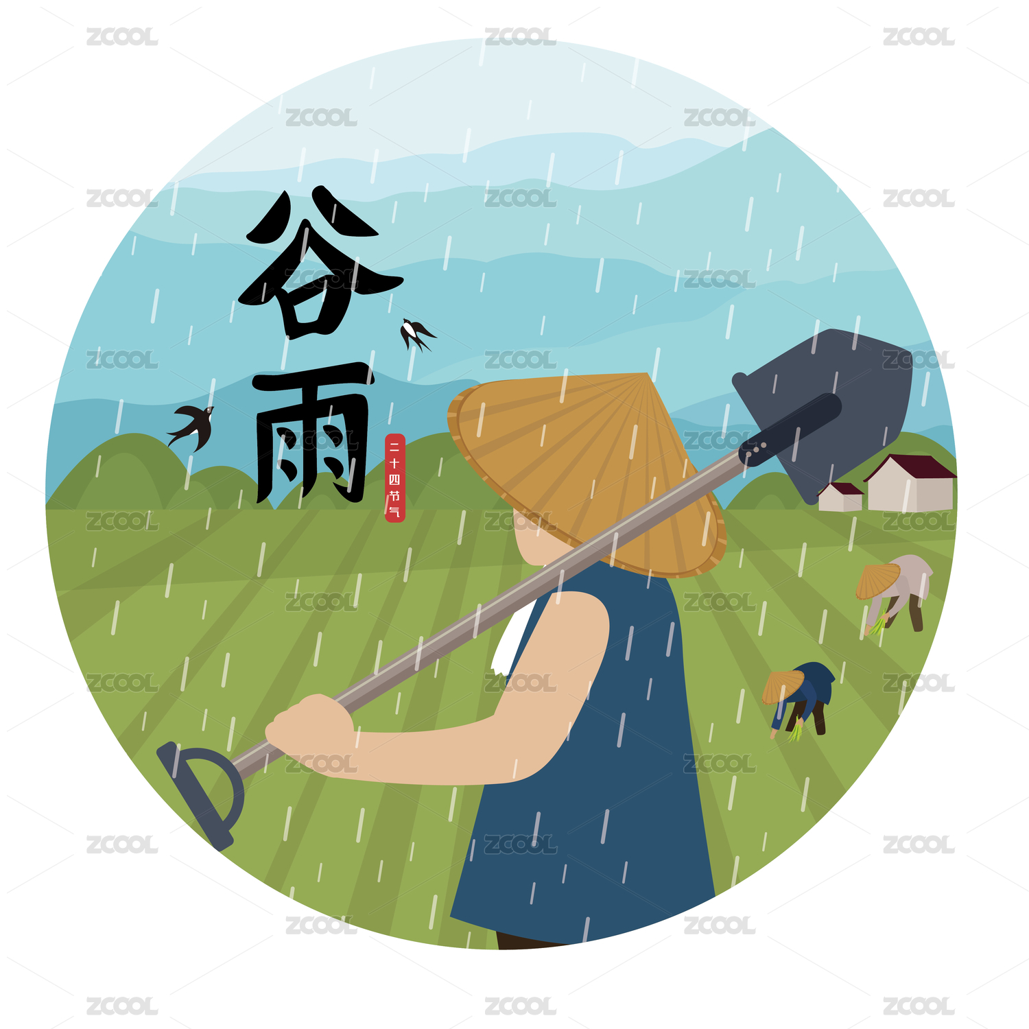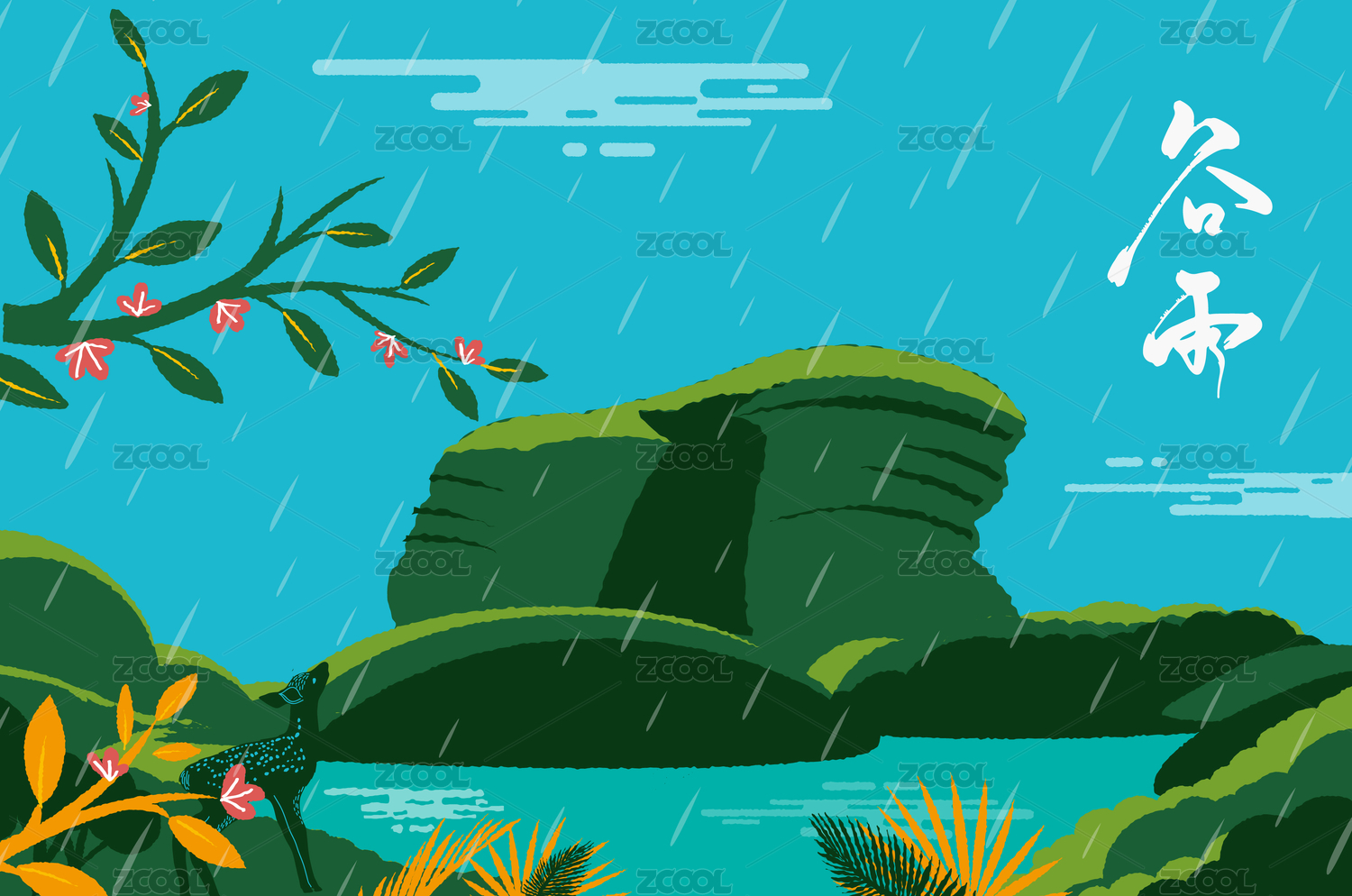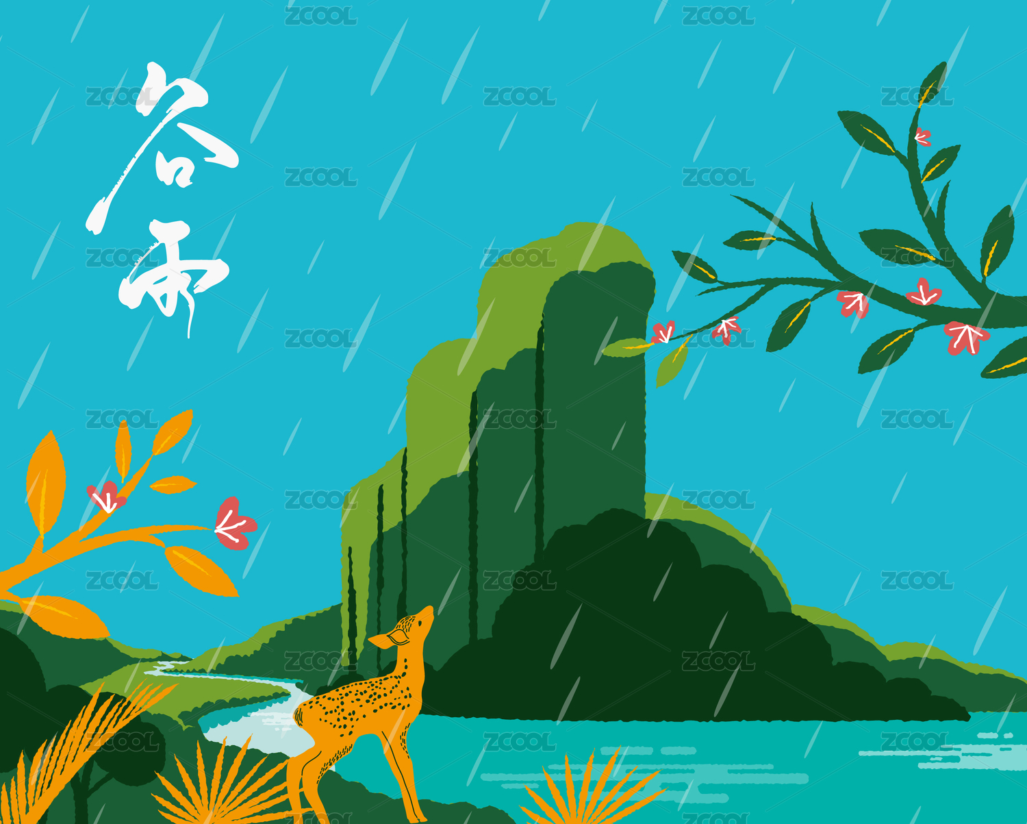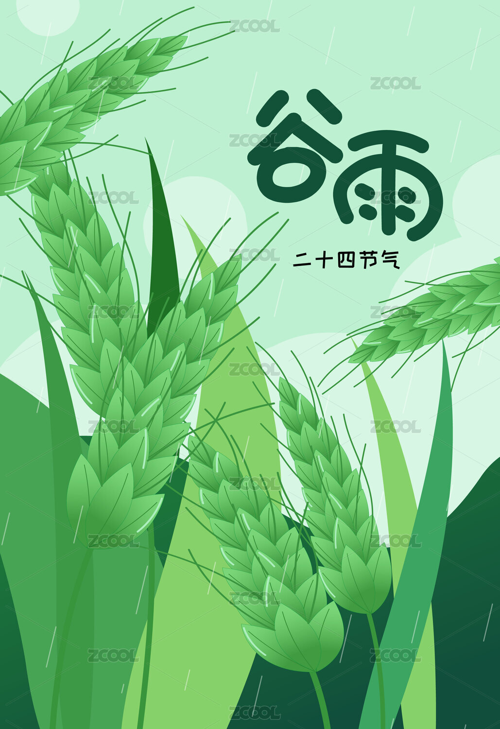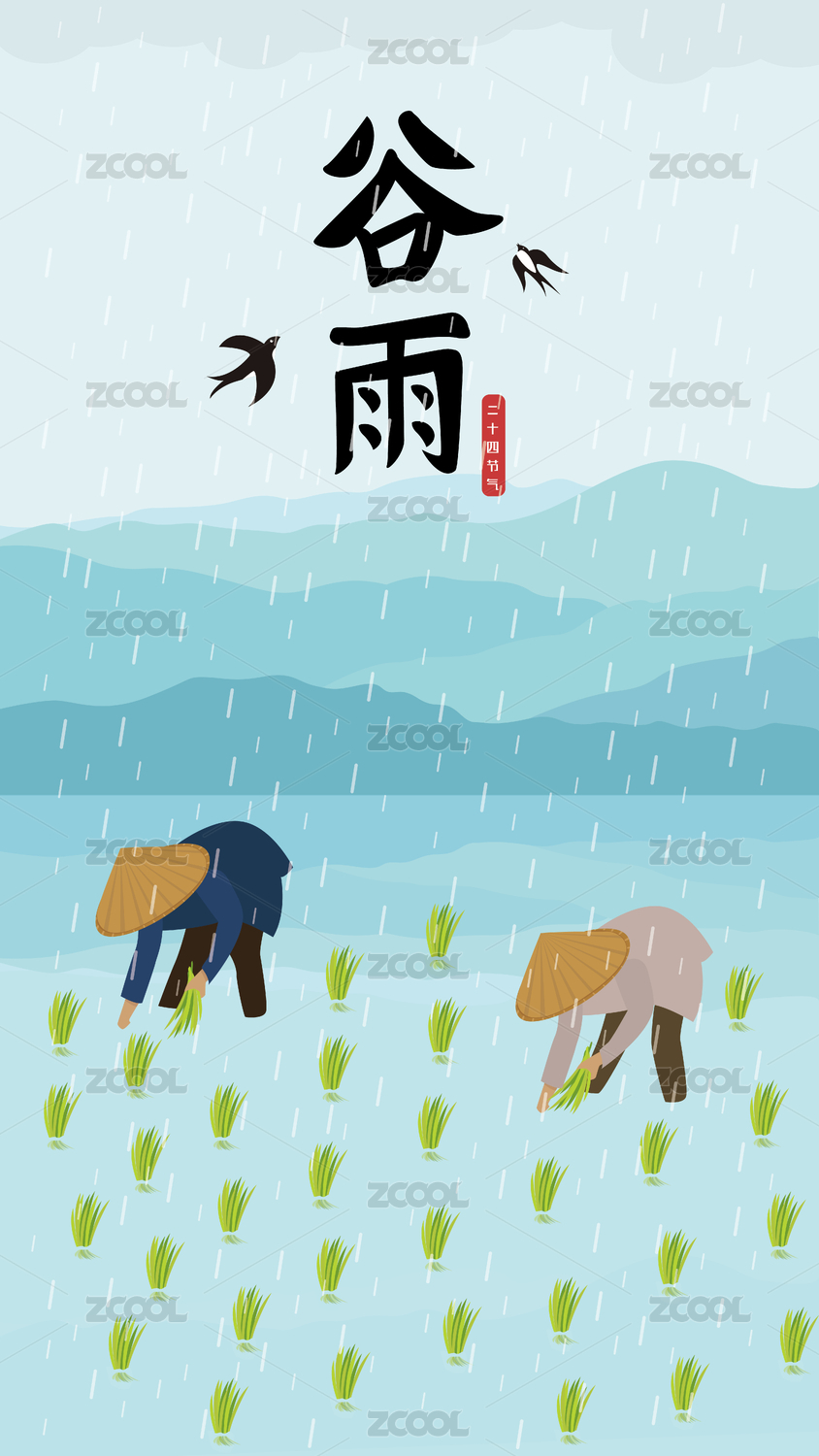 手绘矢量谷雨传统二十四节气插画海报