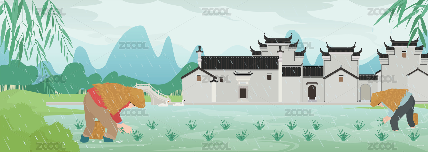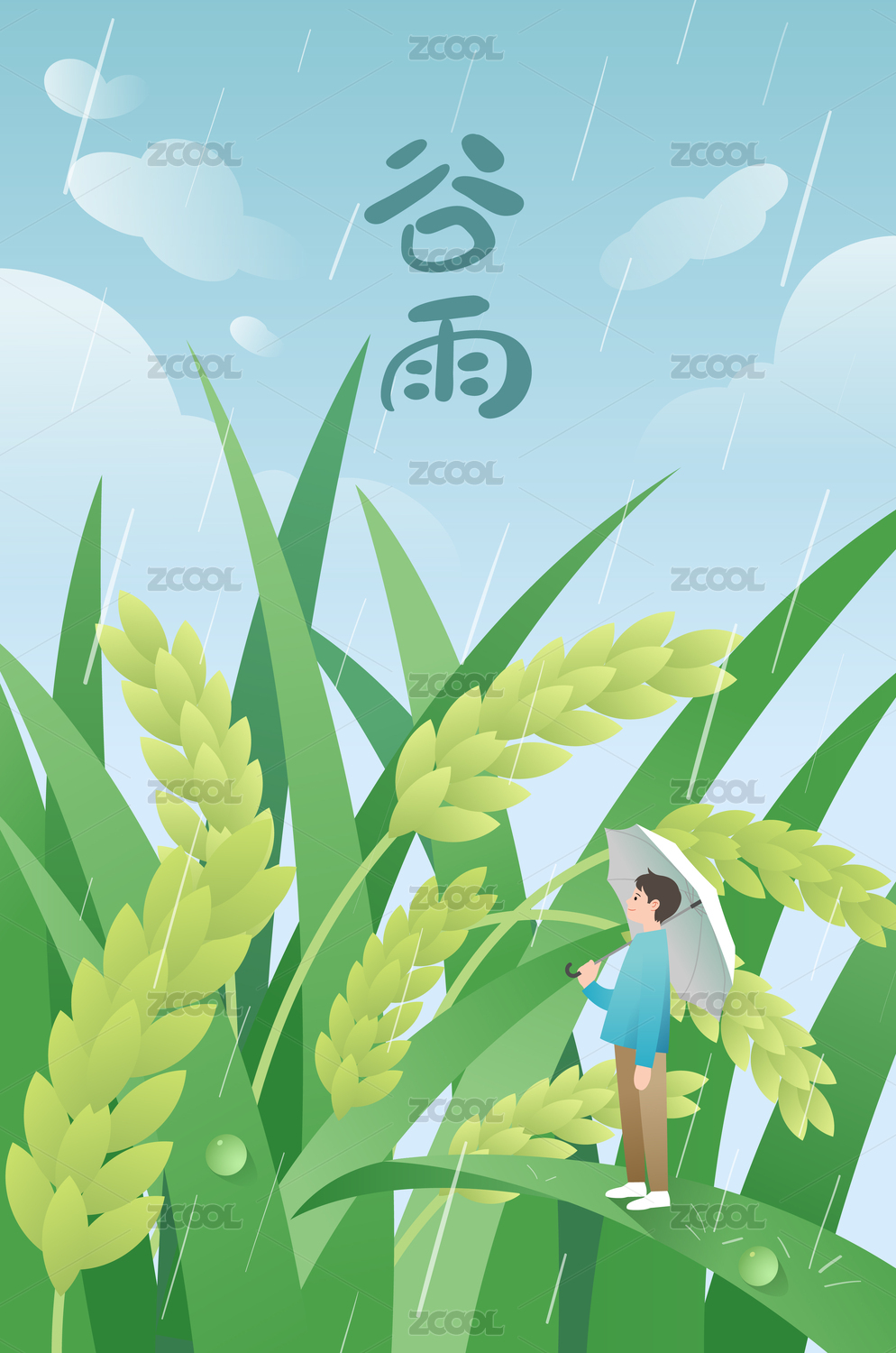 一个男生撑伞站在稻谷上和谷雨字体