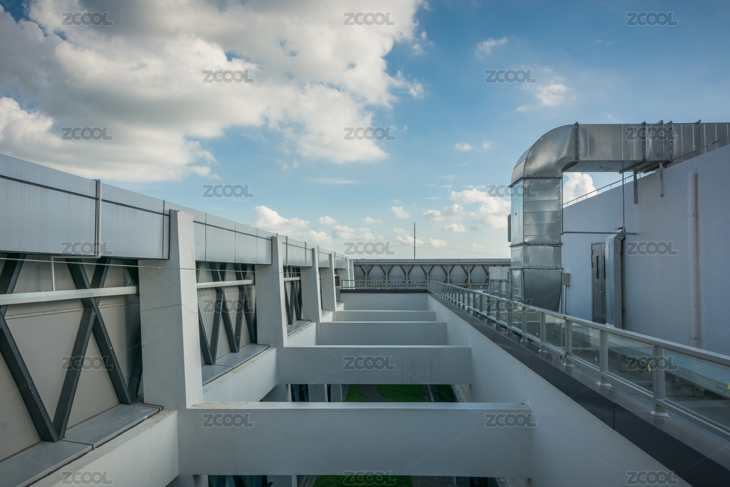 建筑天台上使用白铁制作的通风管道设施