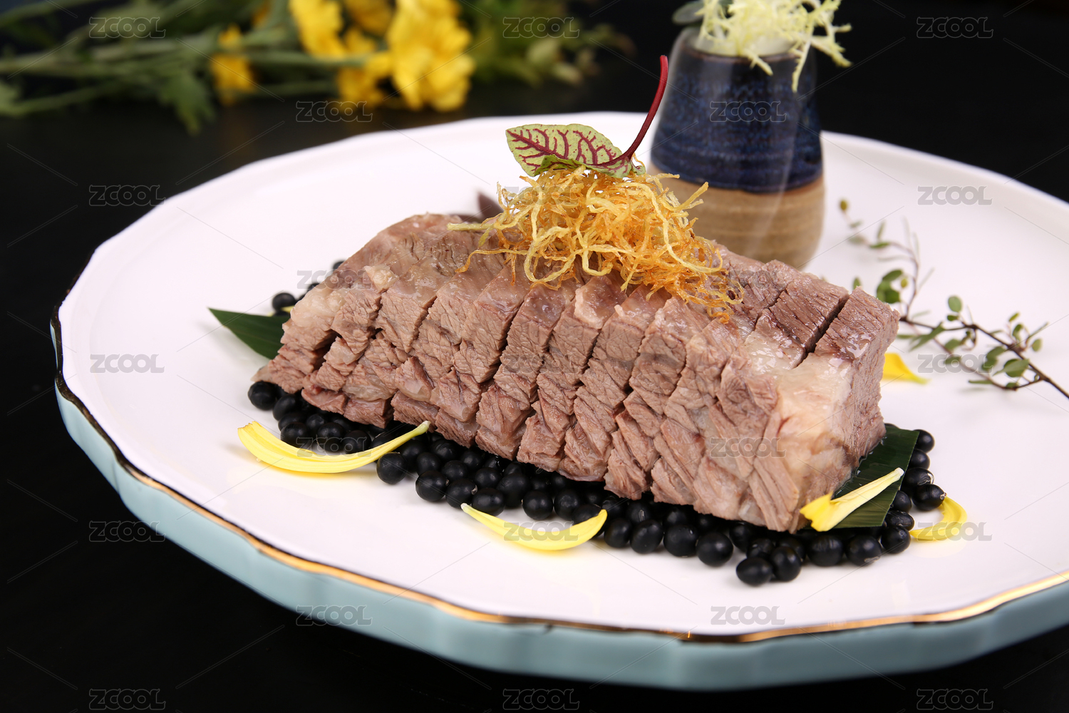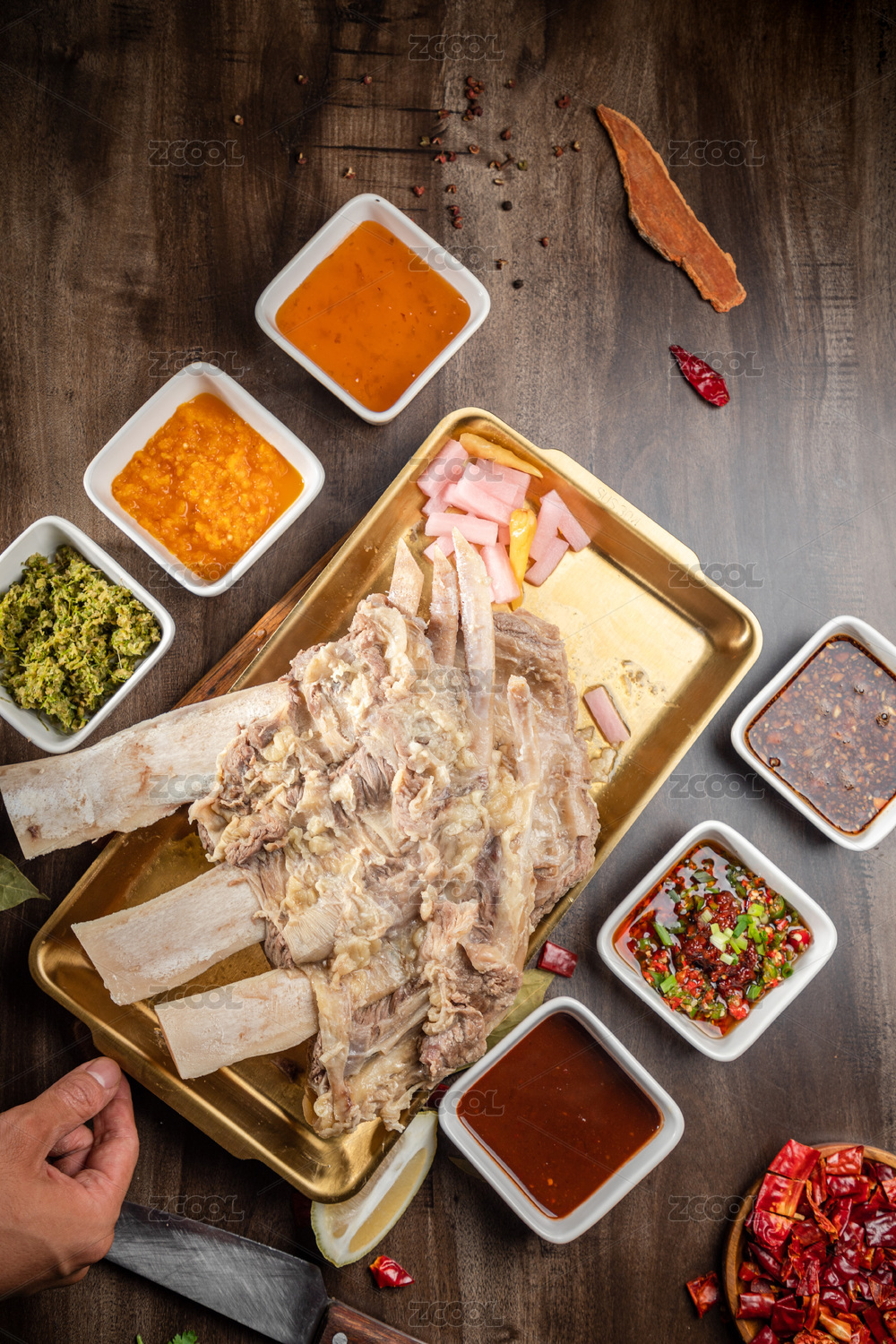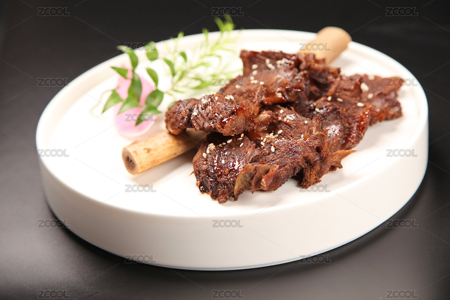 暗色木纹桌上放着一块水煮牛肋骨肉