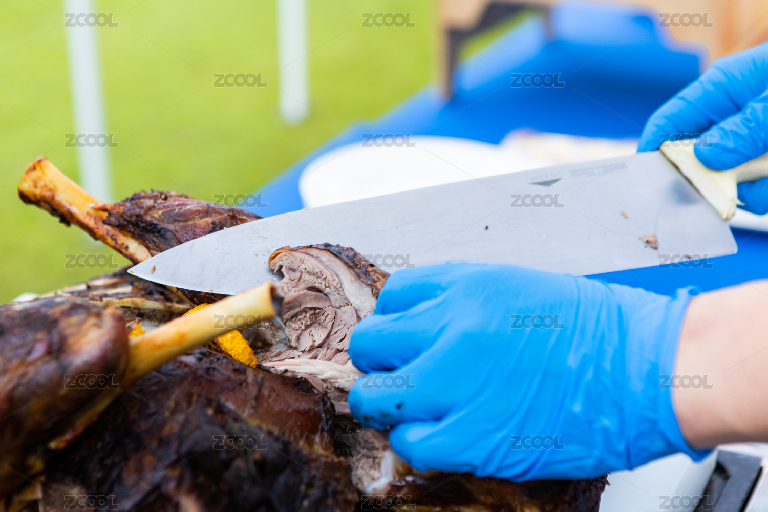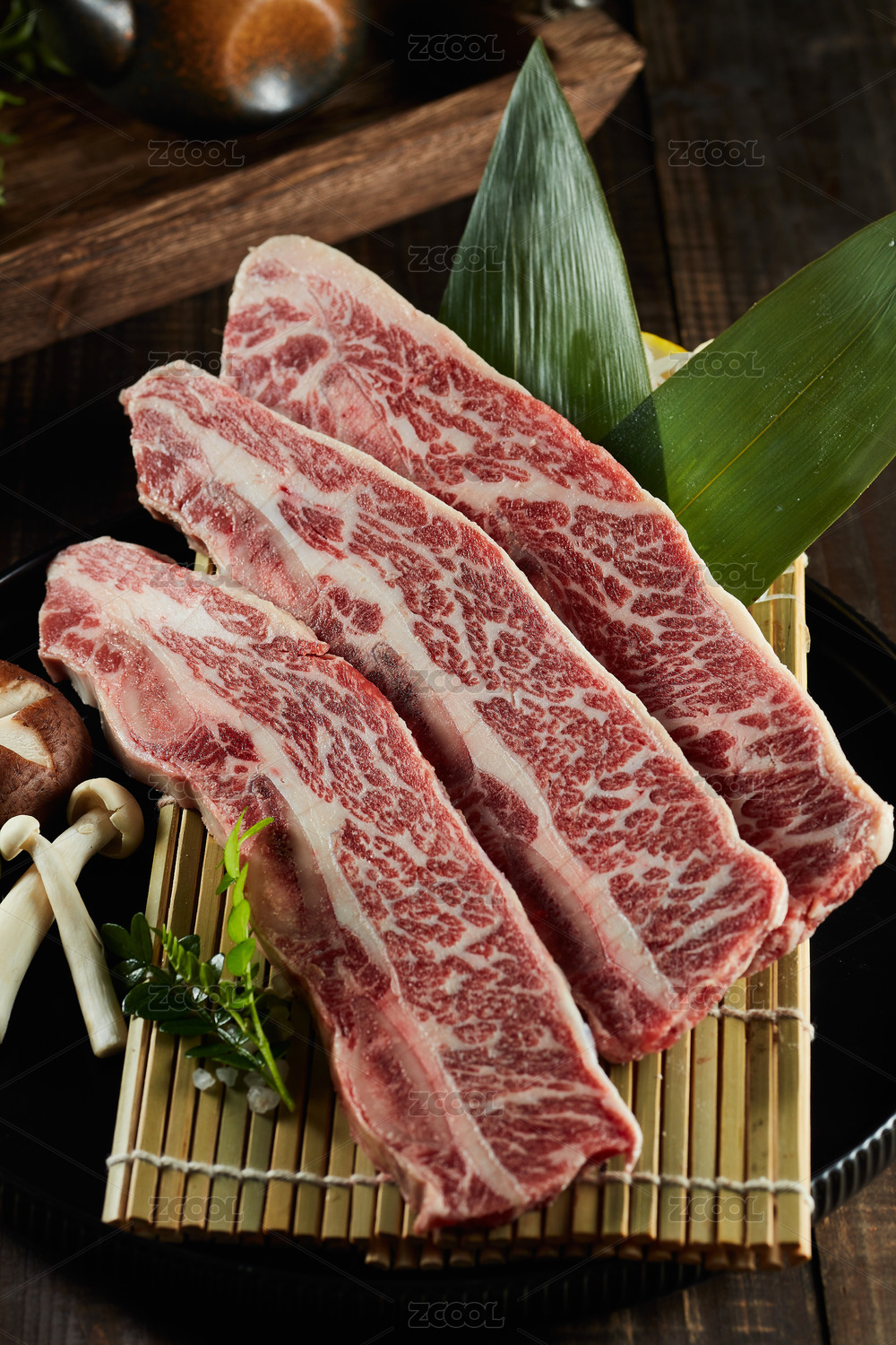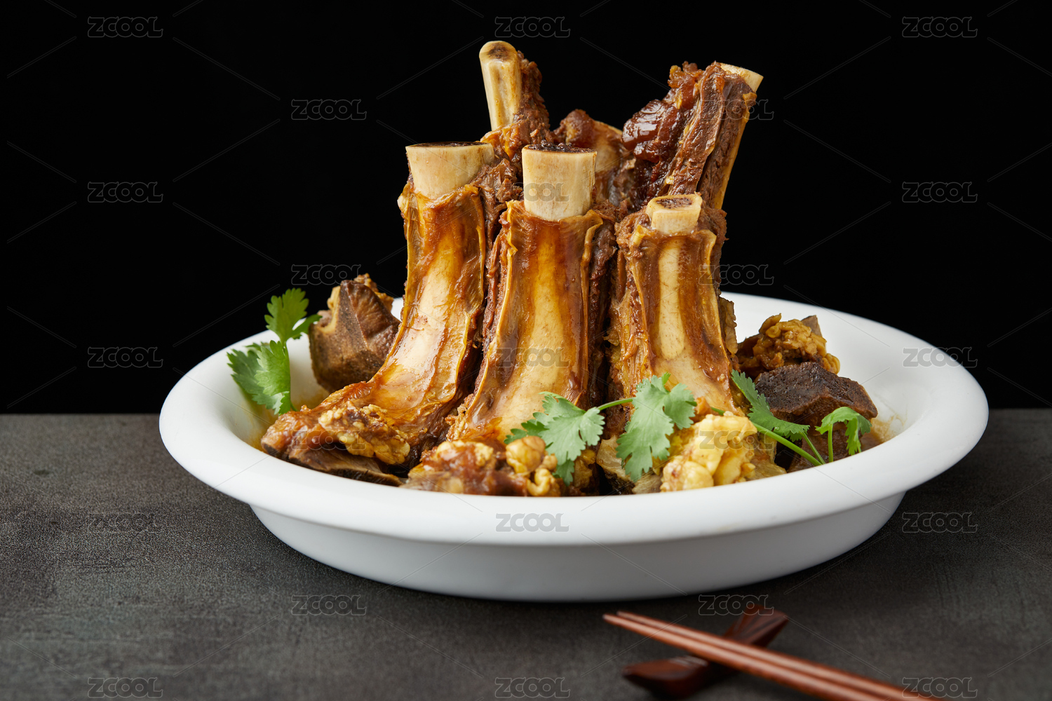 暗色木纹桌上放着一块水煮牛肋骨肉