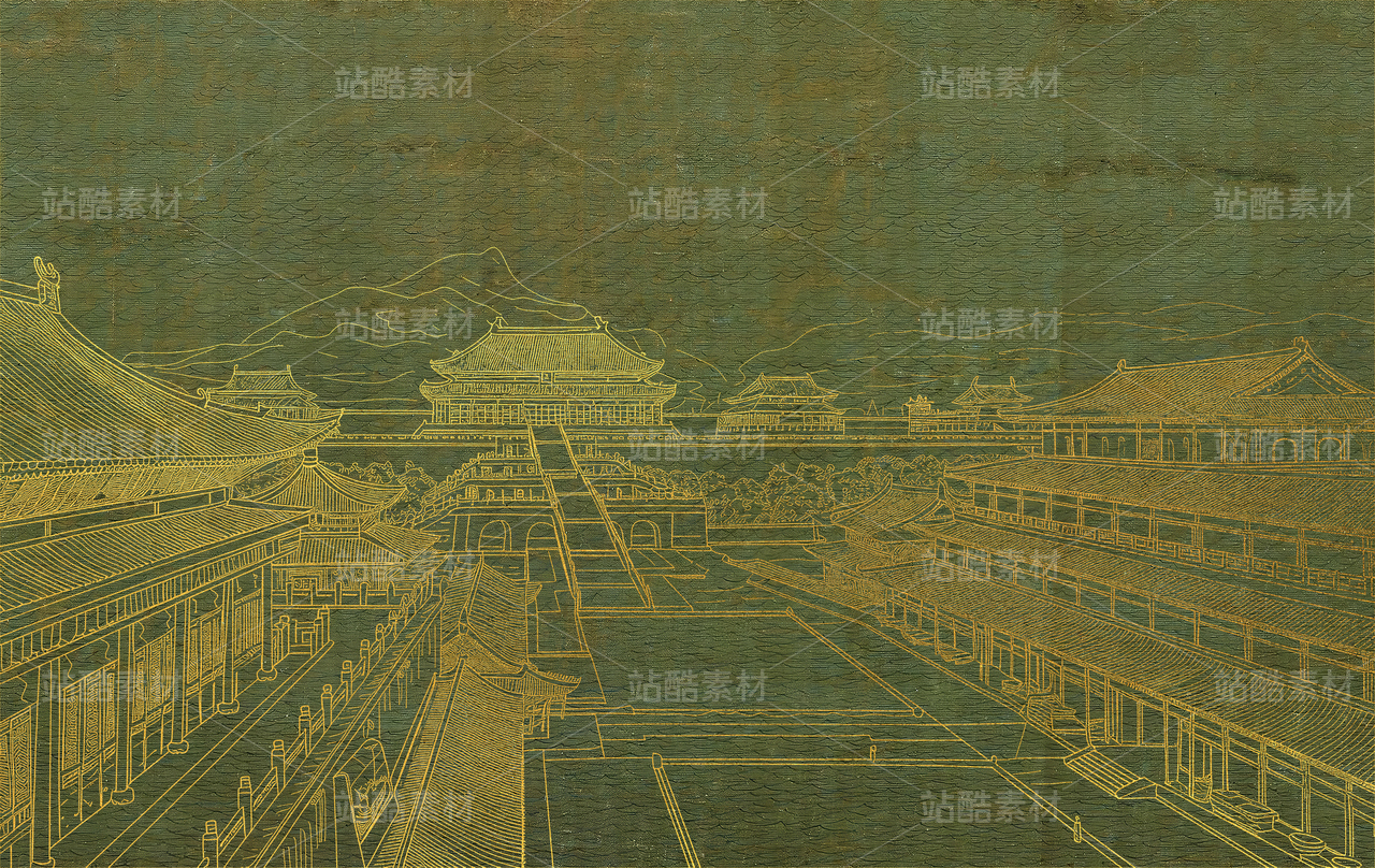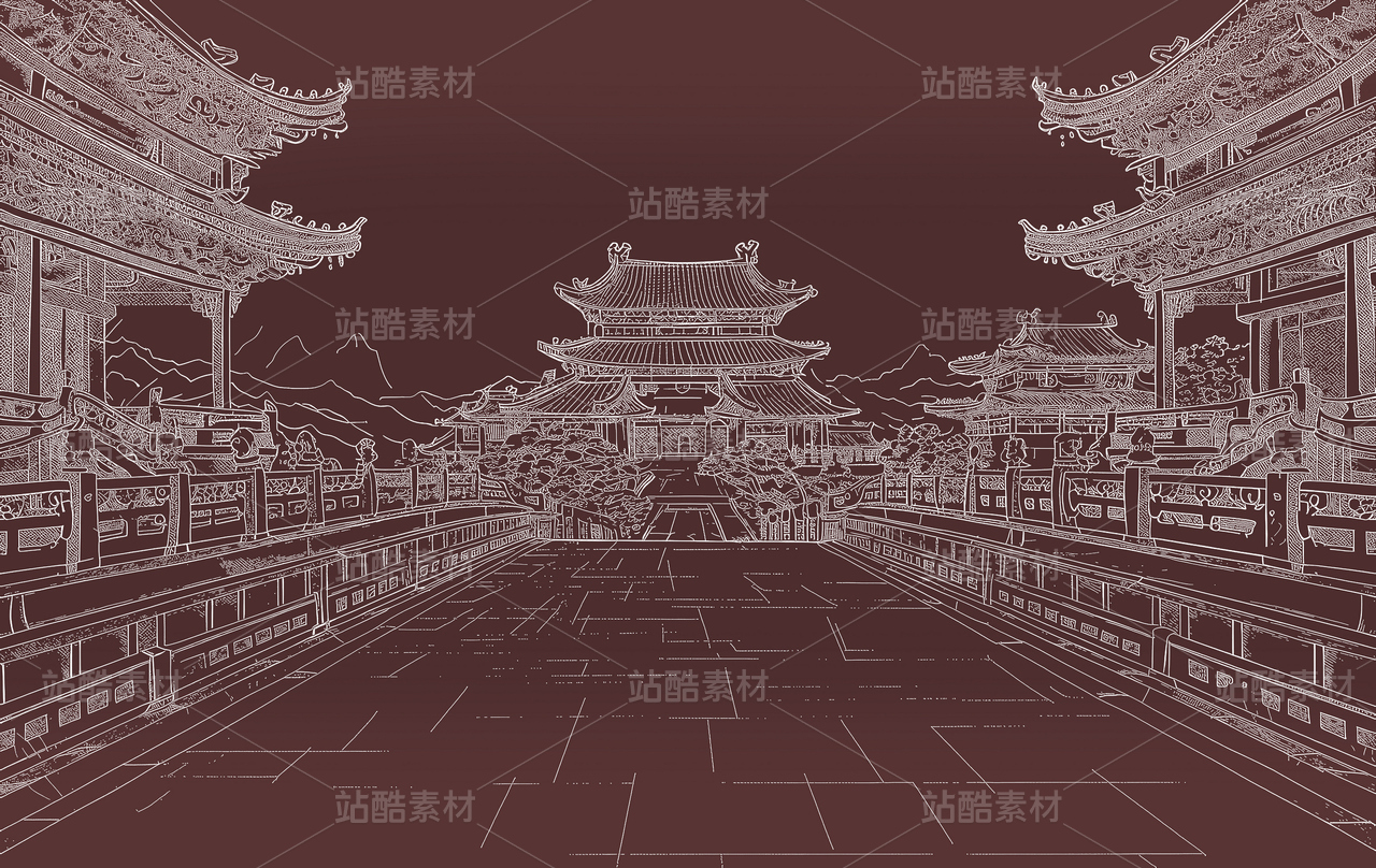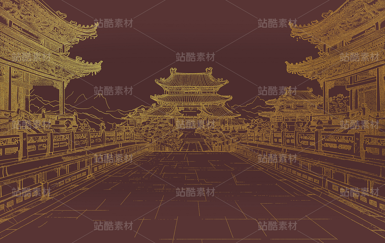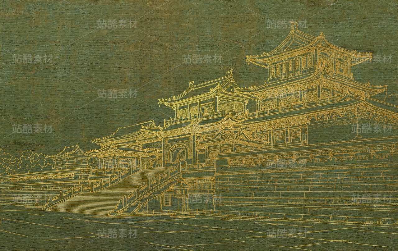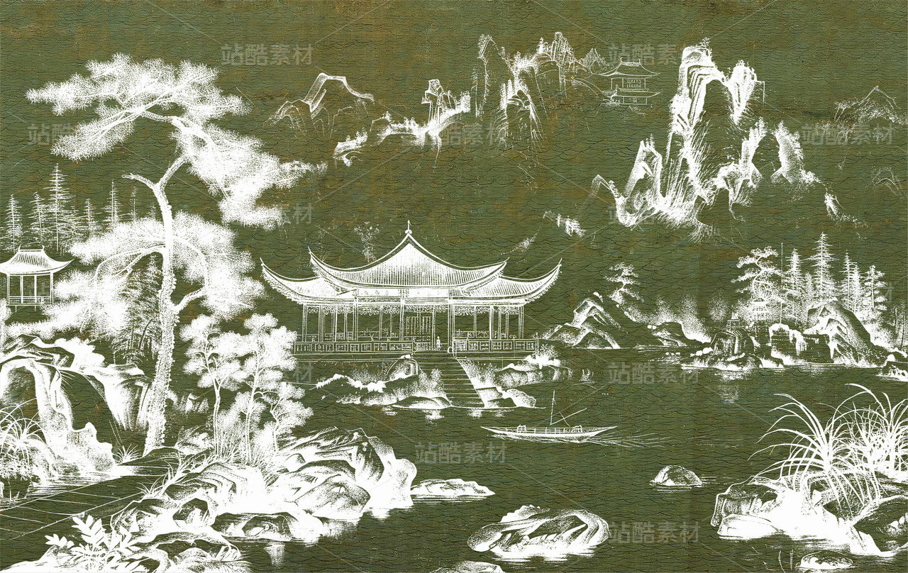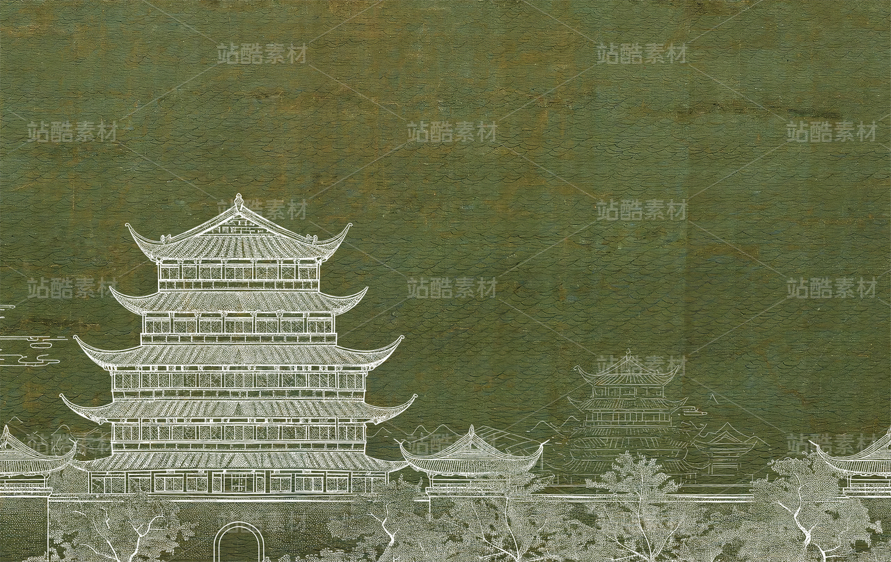 新中式国风亭台楼阁建筑工装背景墙壁画
