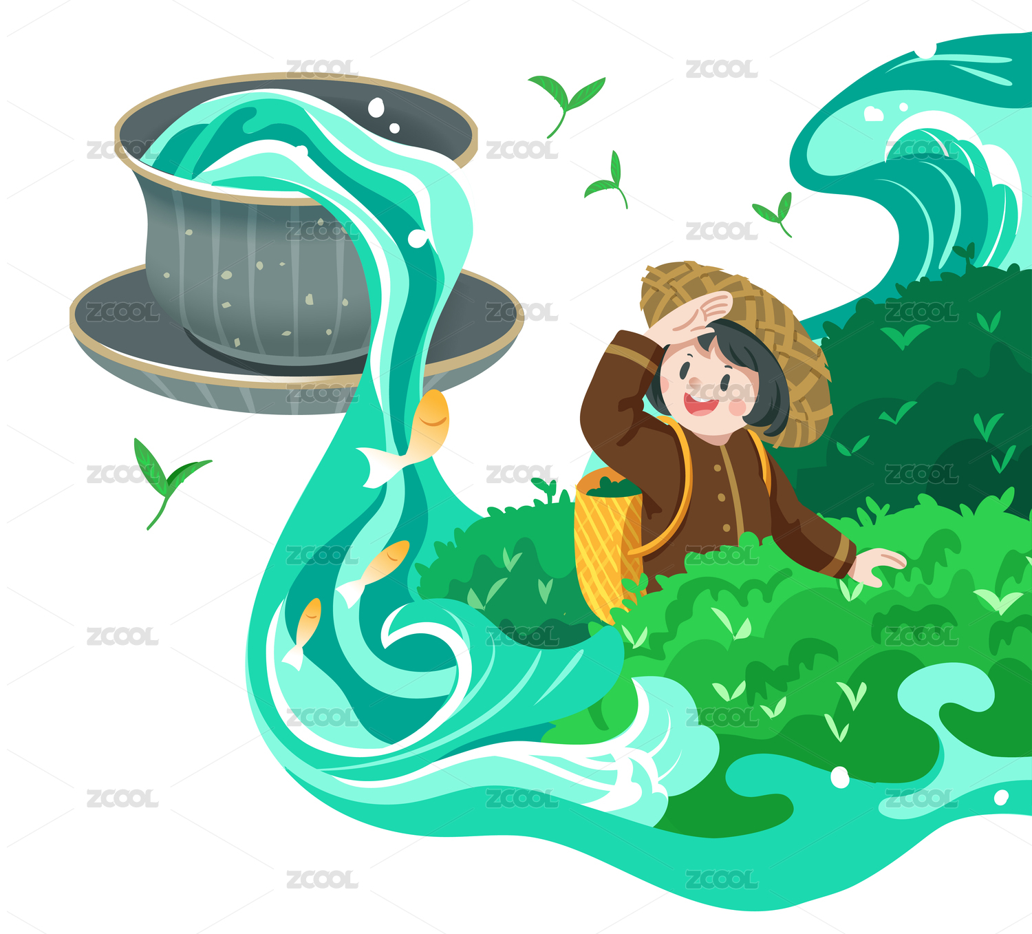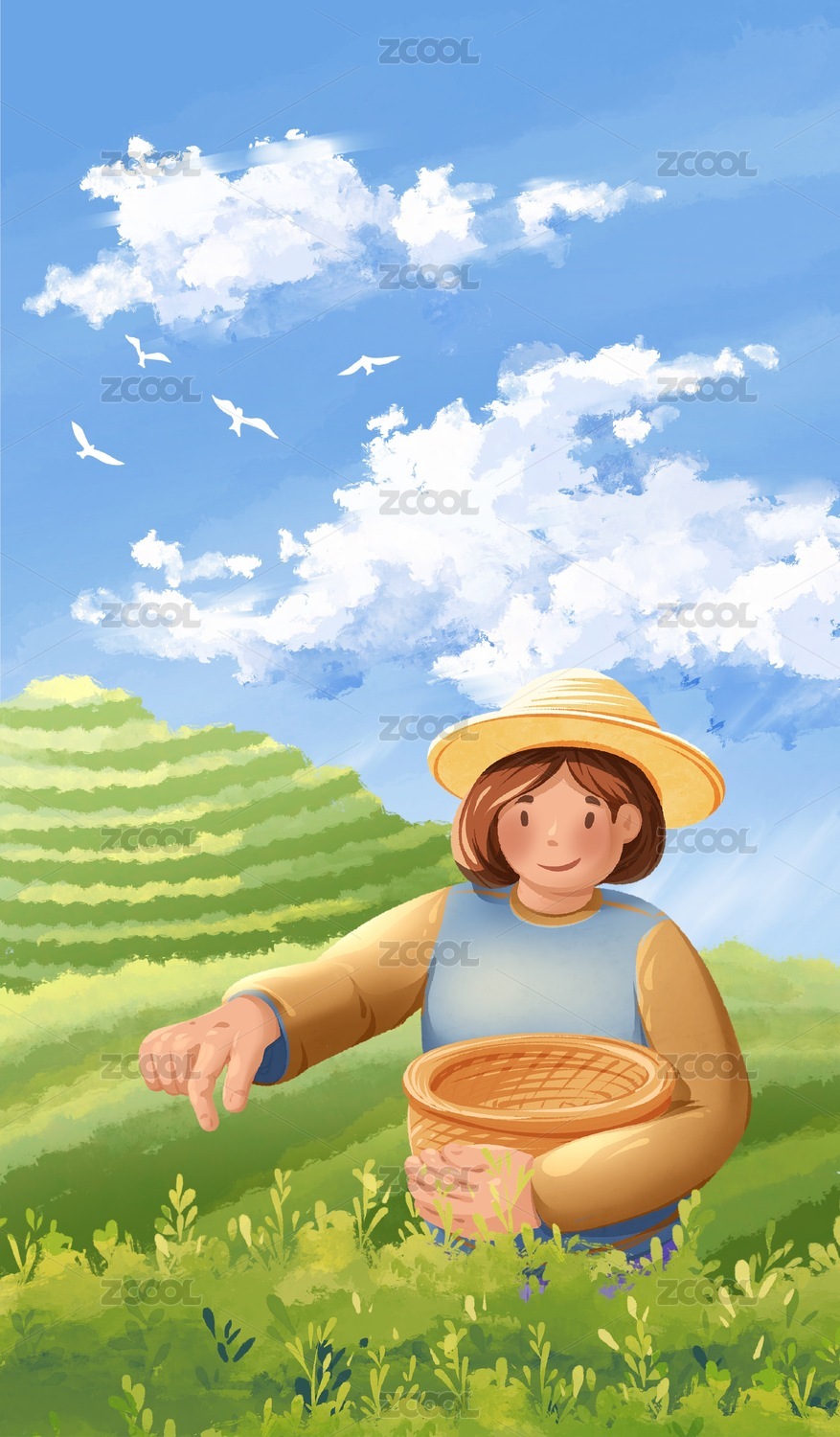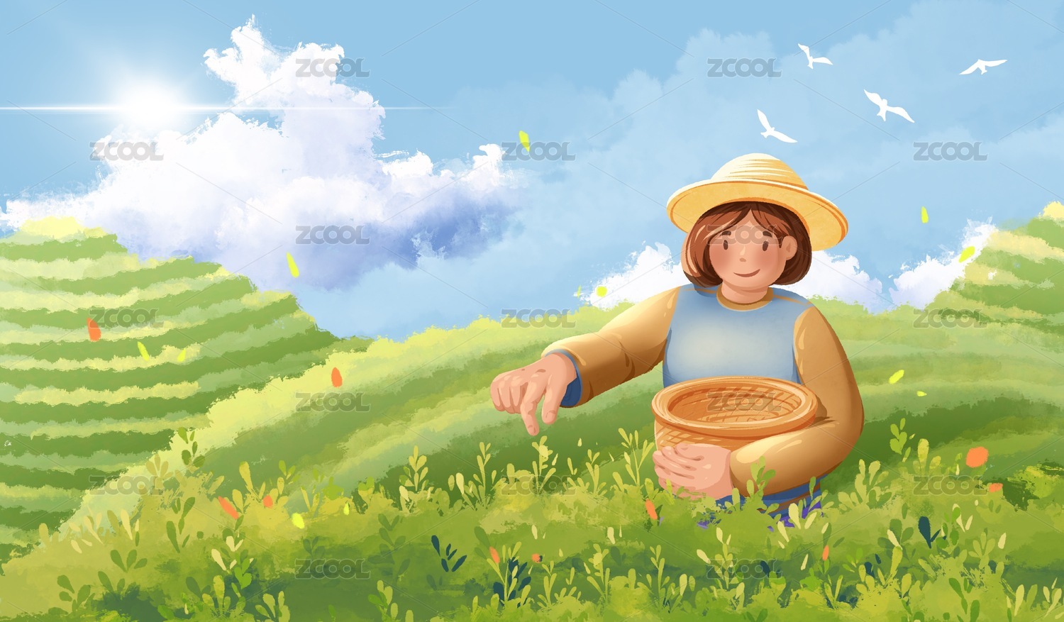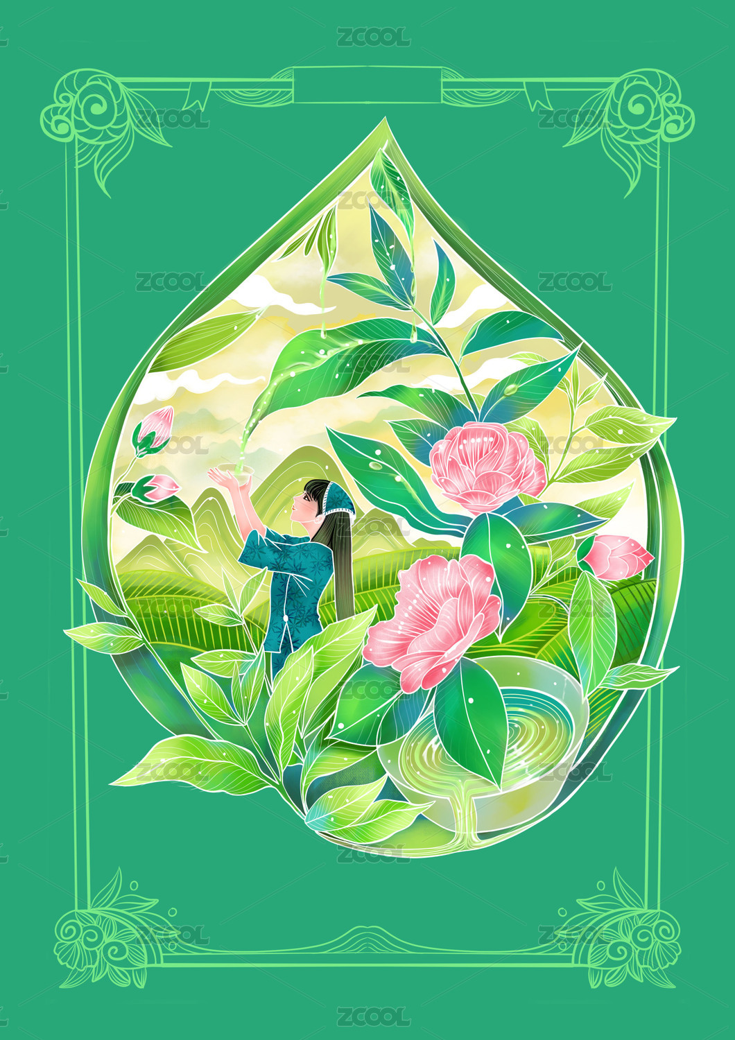 清明节采茶国潮插画中国风茶叶茶园风景海报