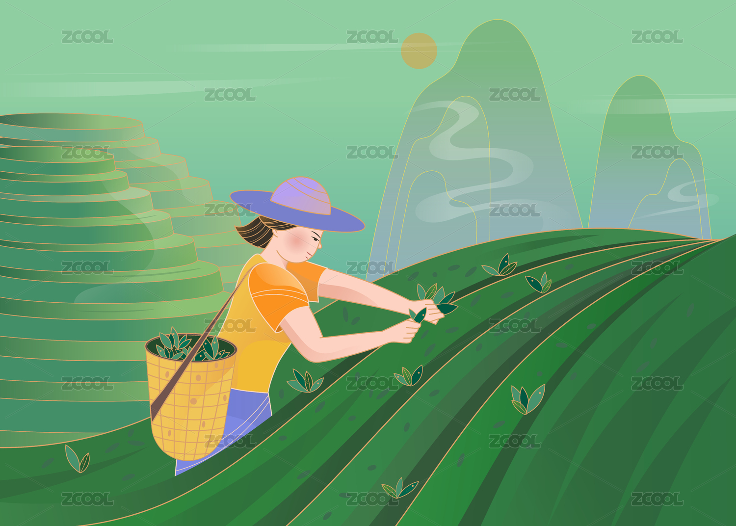 国潮风格山茶花茶园里采茶的采茶女包装插画