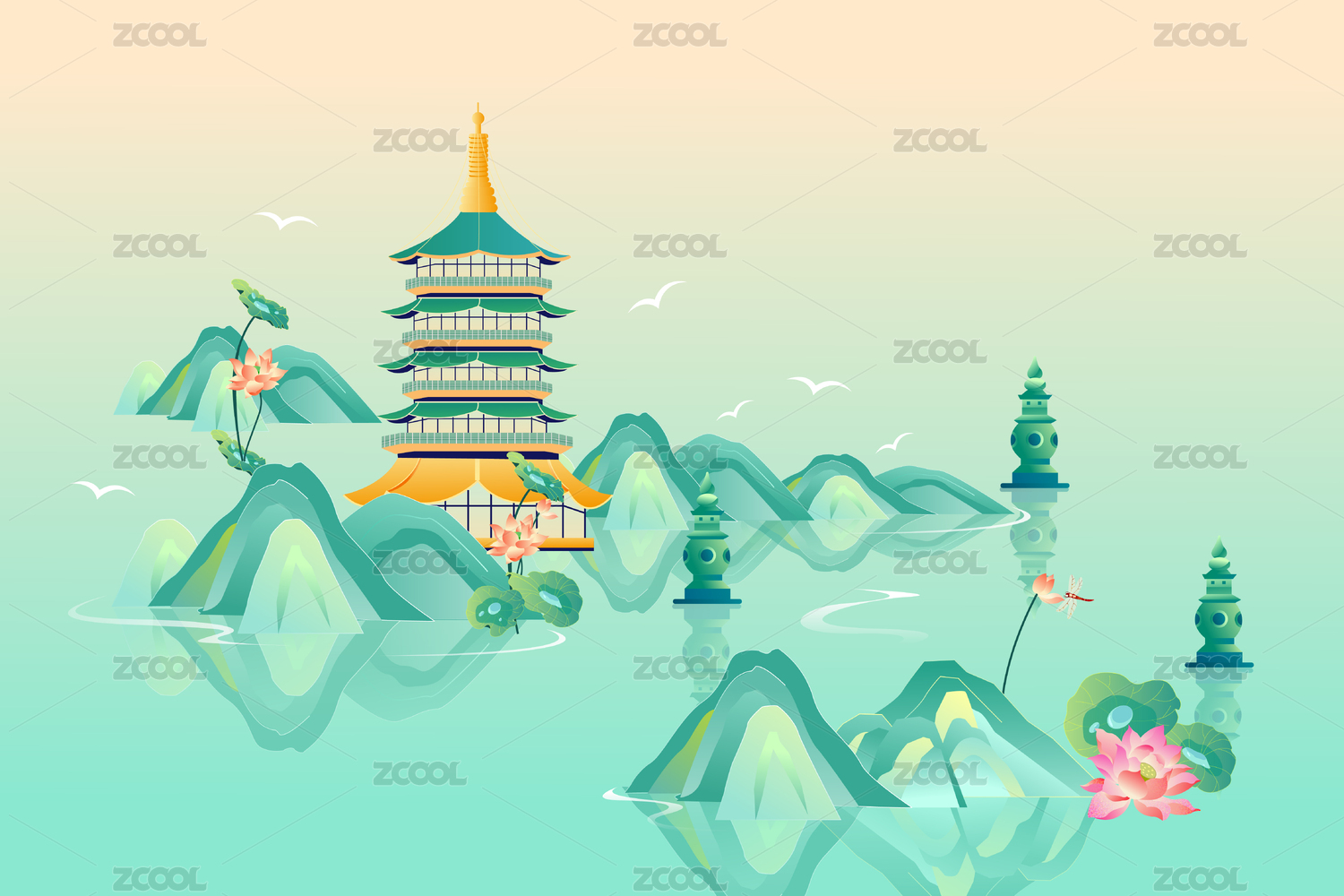 杭州西湖雷峰塔中国风原创插画
