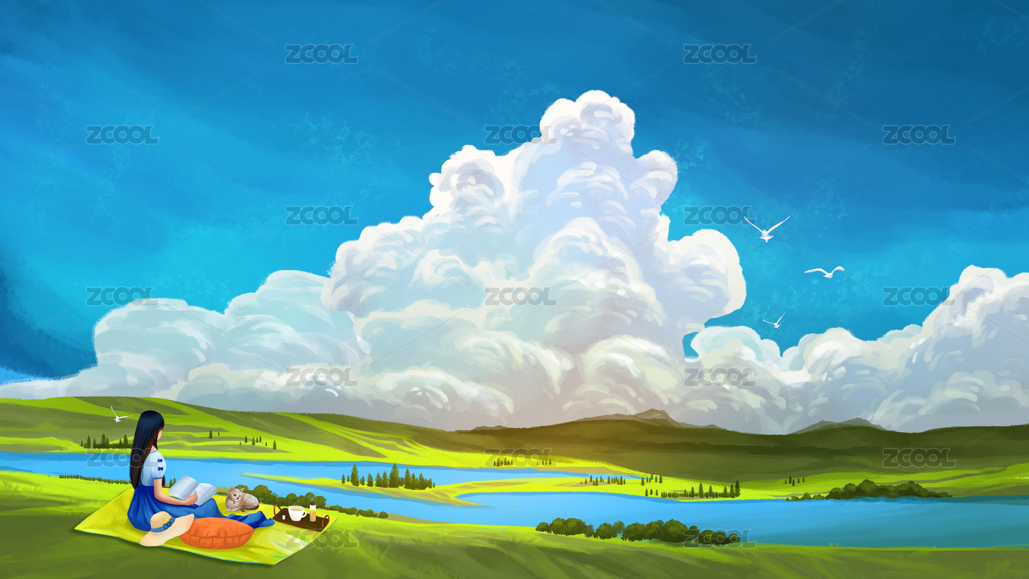在绿色草原野餐的女孩 数码绘画 写实插画