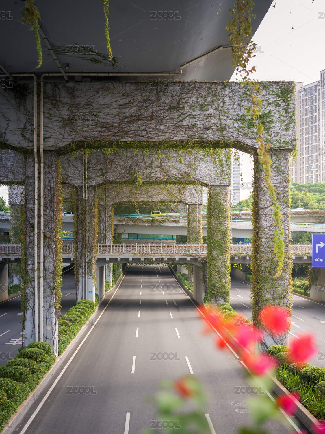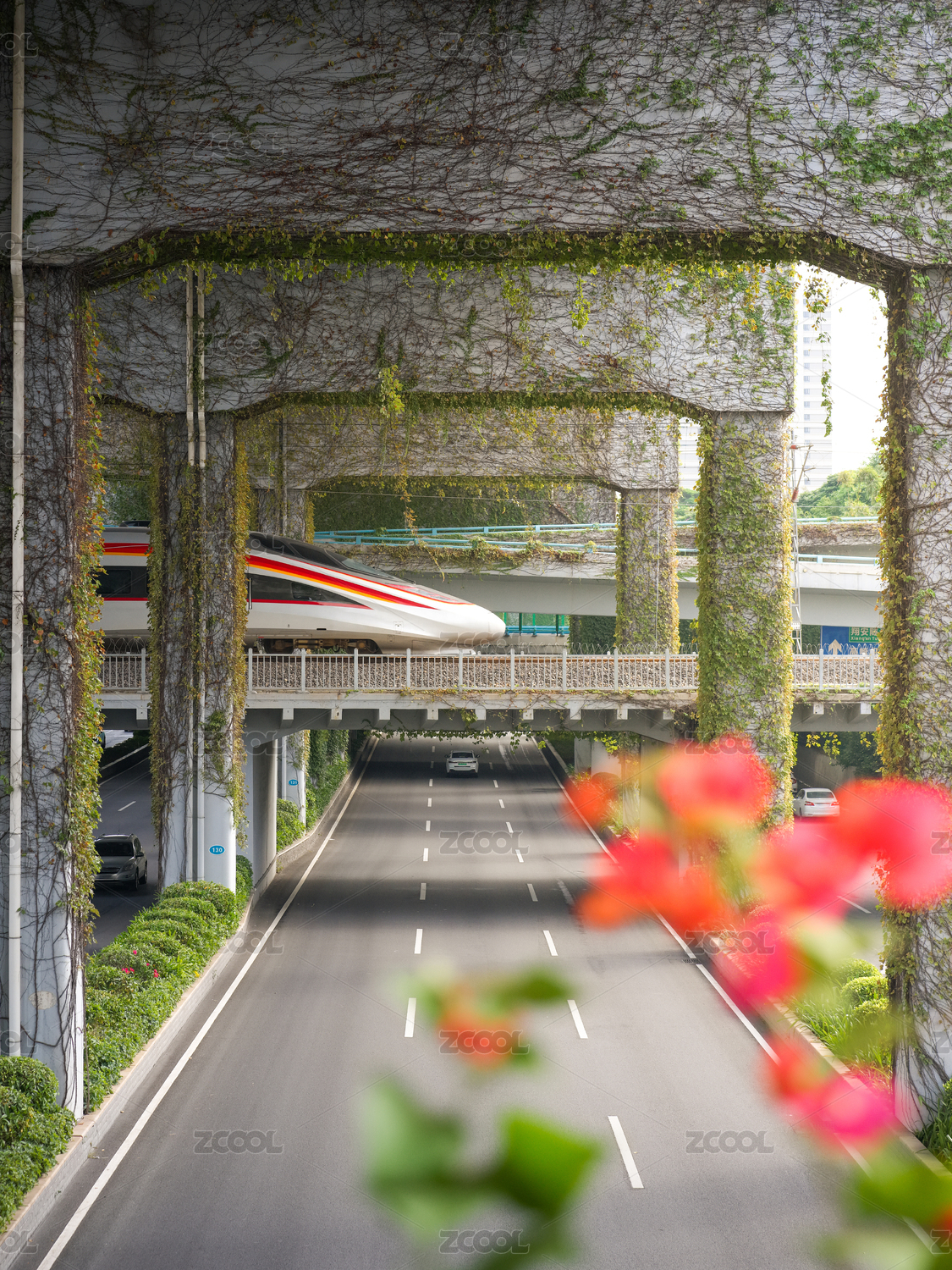 福建厦门城市高架桥上的绿色植物与红色花朵