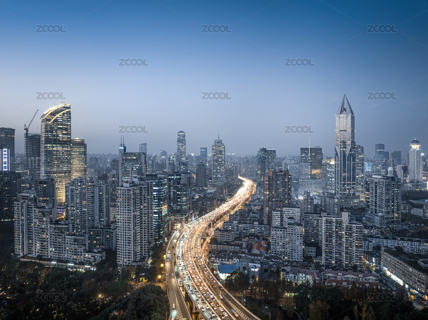 上海城市天际线夜景与蜿蜒的高架桥