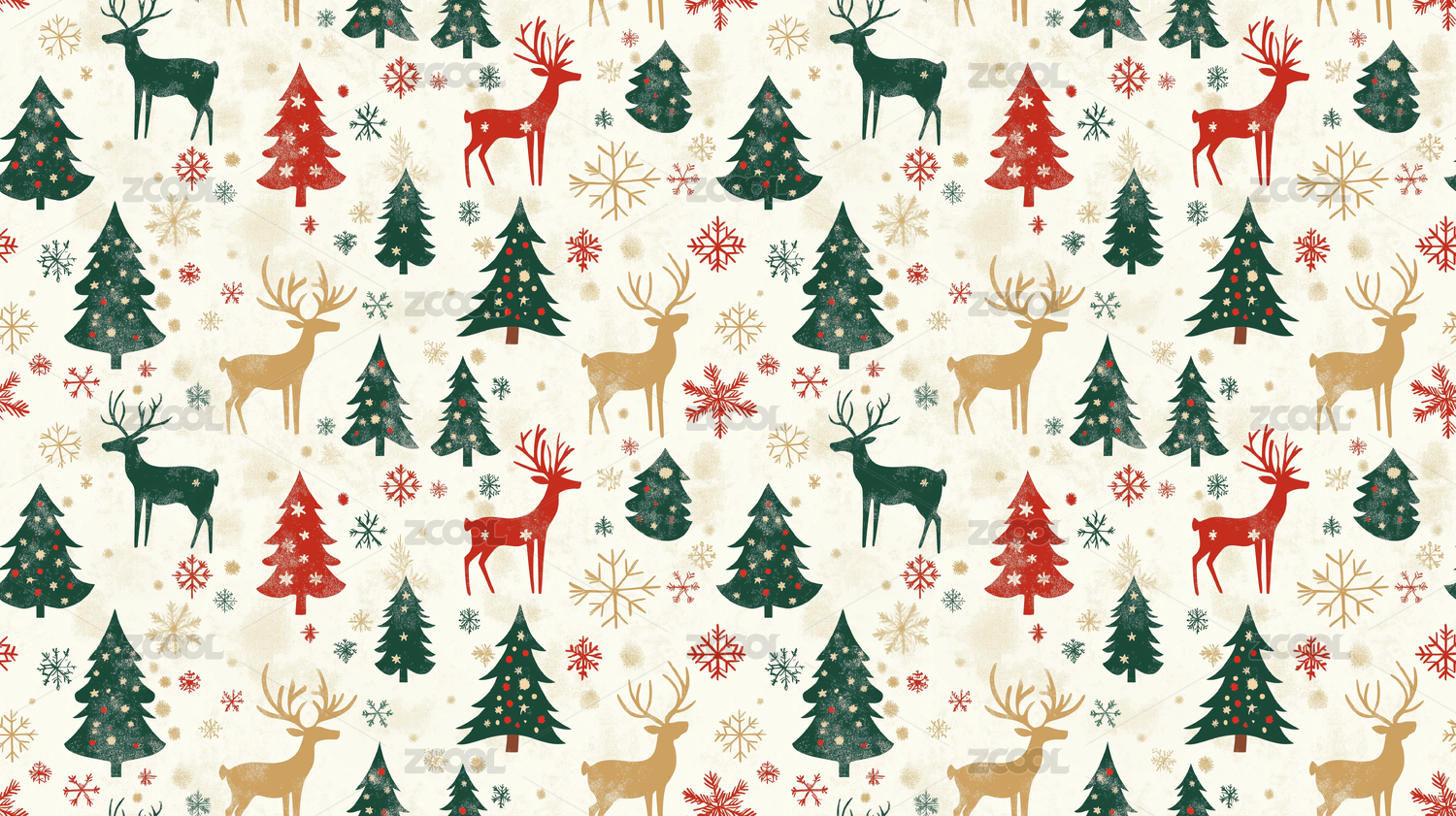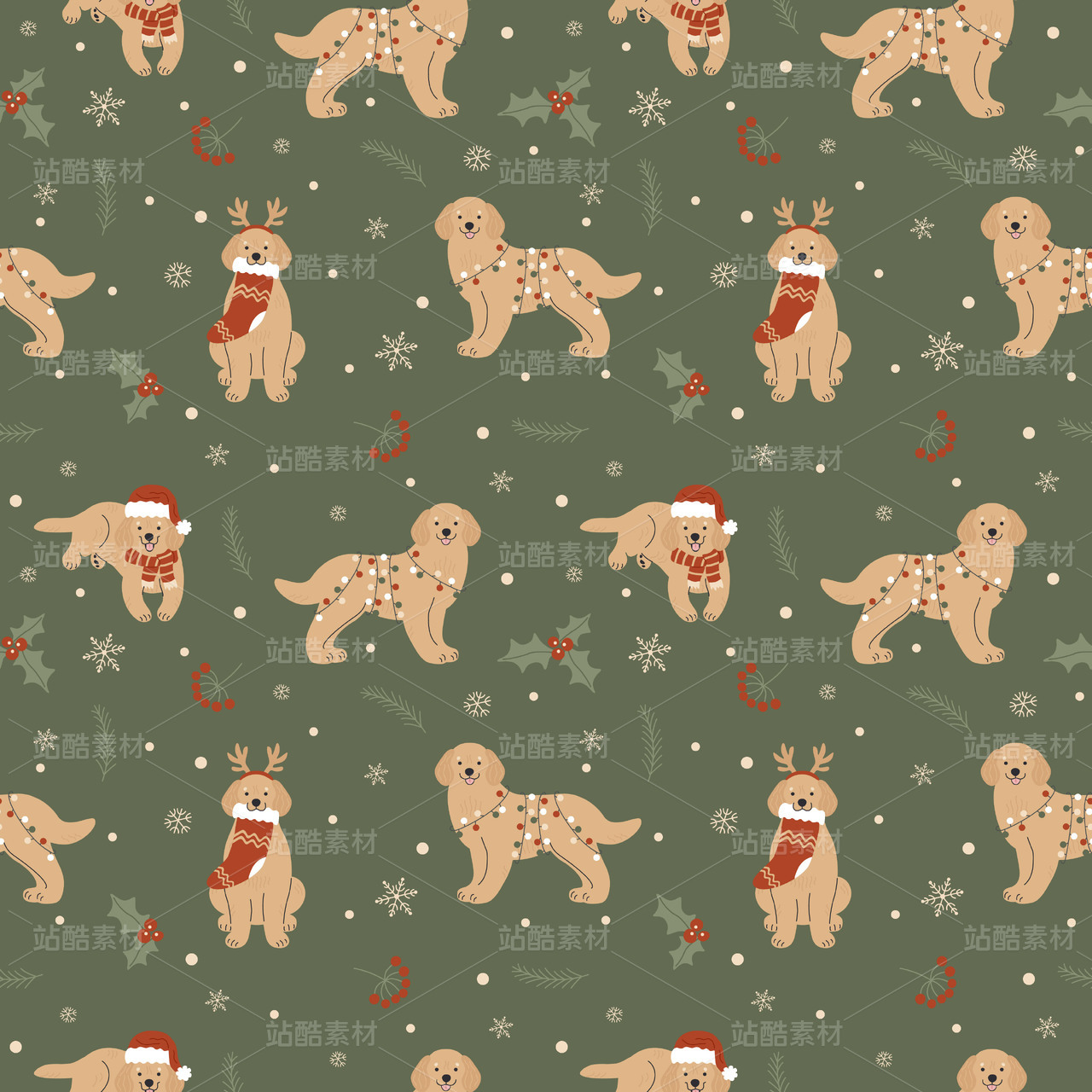 圣诞节金毛小狗矢量扁平风四方连续图案-深色