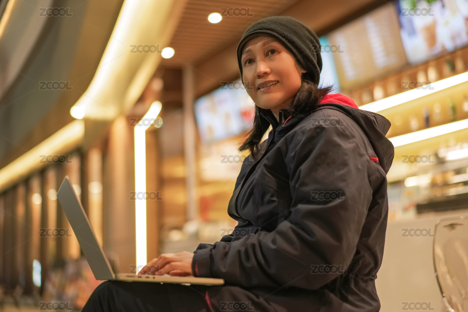 在城市咖啡馆享受远程工作的女性