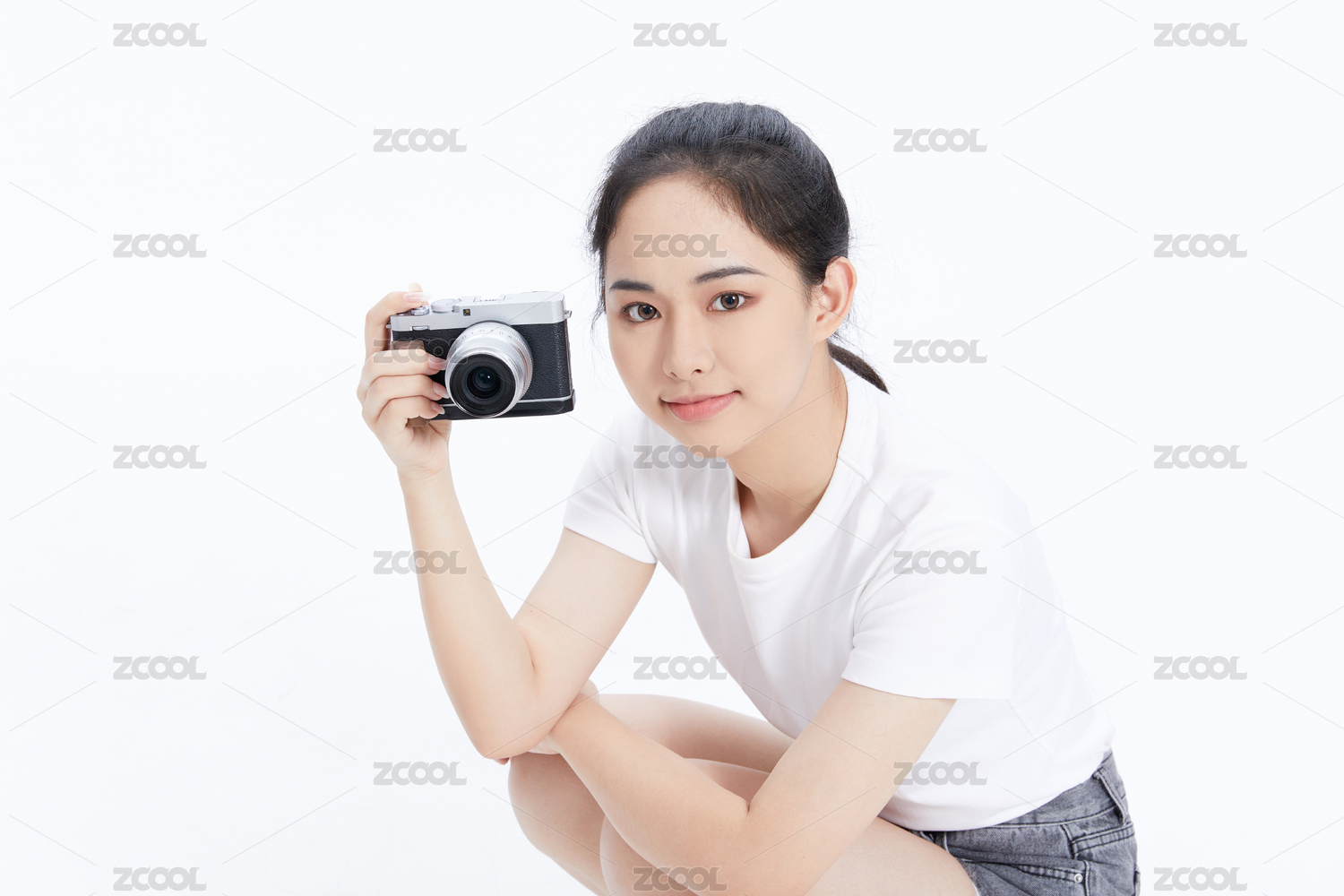 诱人的优雅女摄影师拿着相机业务审核工作画面和选择照片进行编辑润饰坐在办公桌。