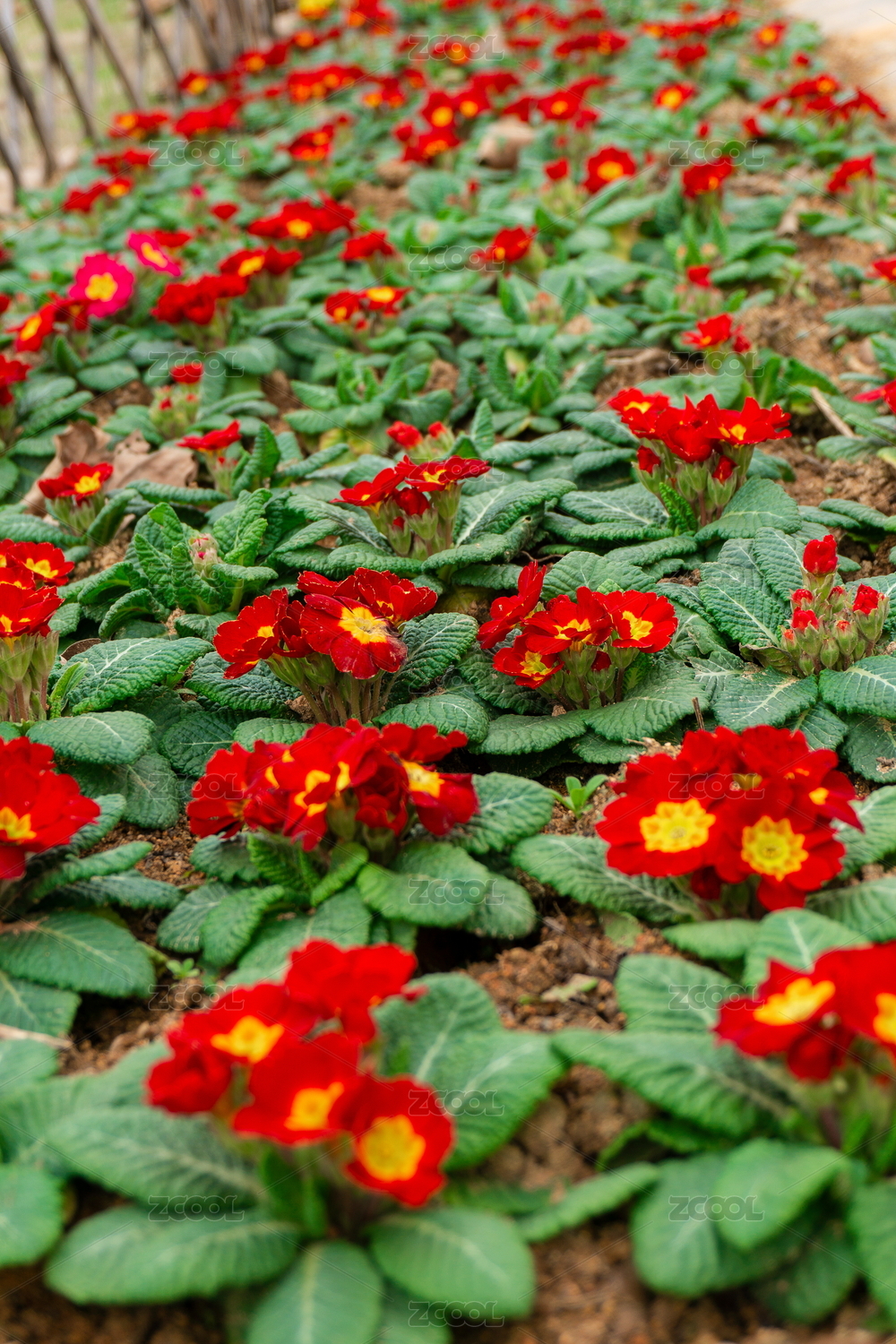 绿叶衬托下的多彩报春花特写