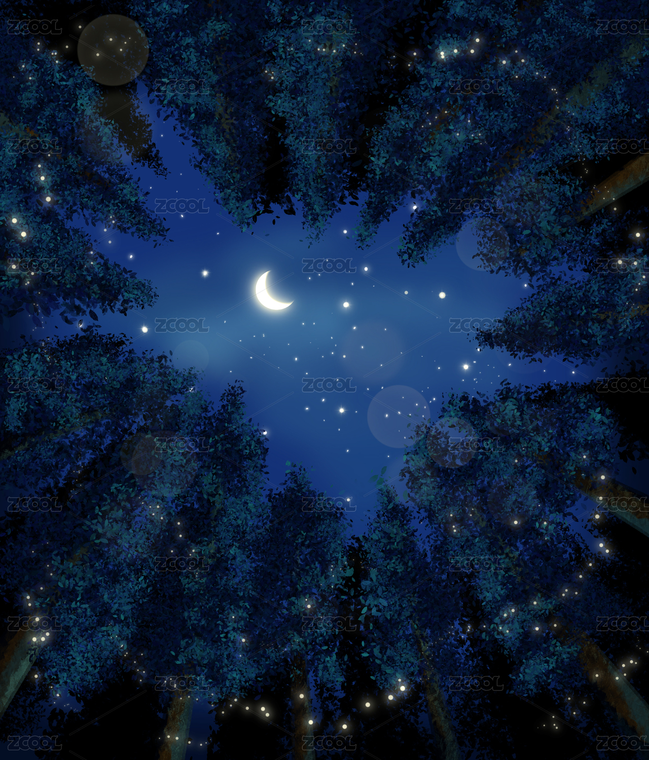 星空 仰视 树林 月牙插画背景壁纸