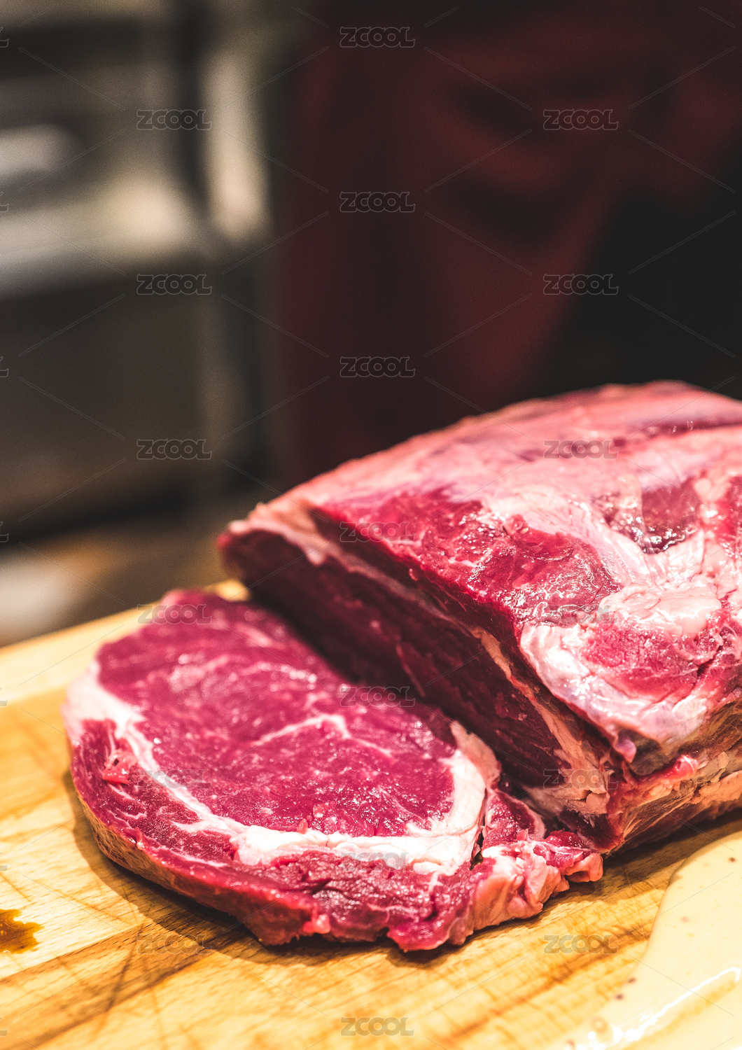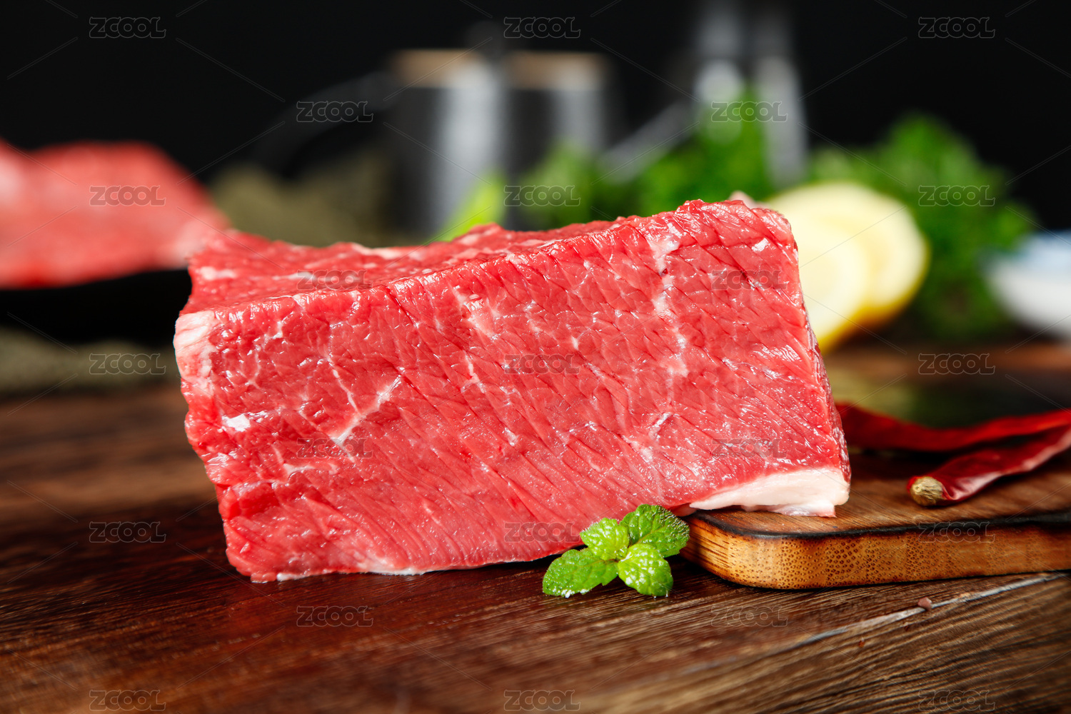 木底上放着一块新鲜进口牛肉