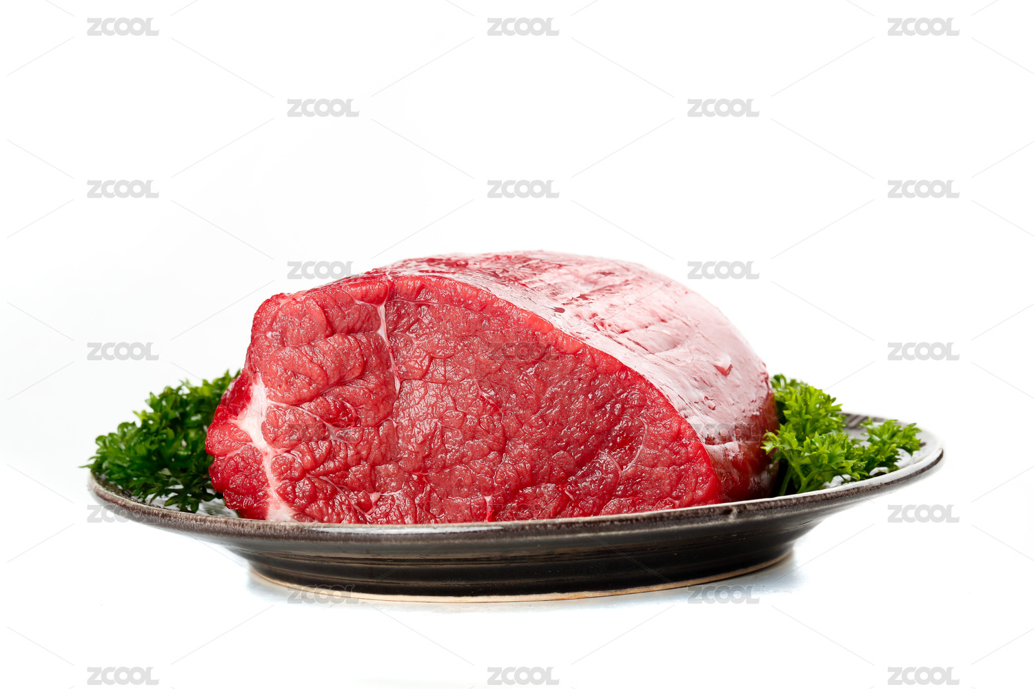 白底上盘子里放着一块新鲜进口牛肉