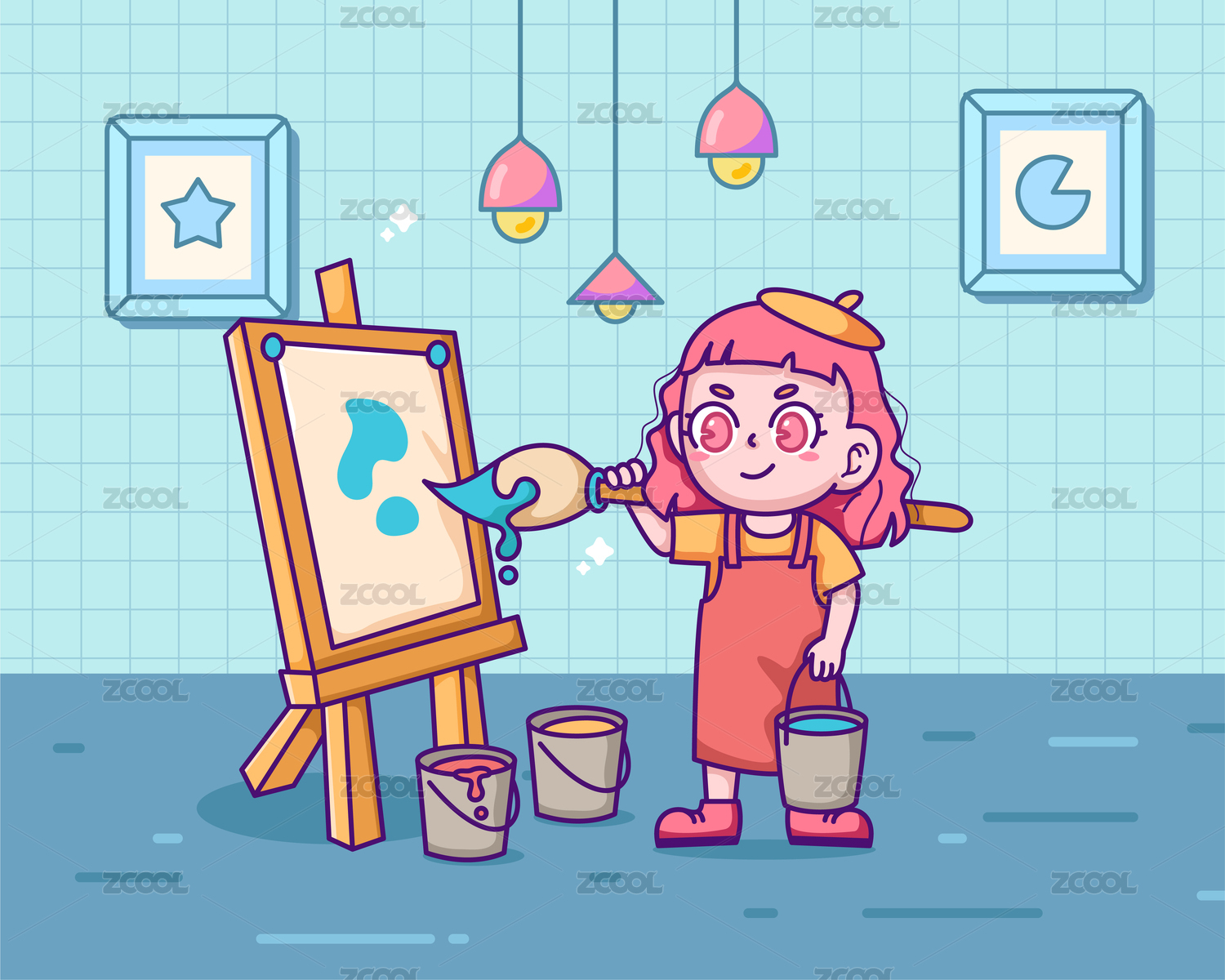 扁平风画画的涂鸦女孩绘画美术课暑假兴趣班