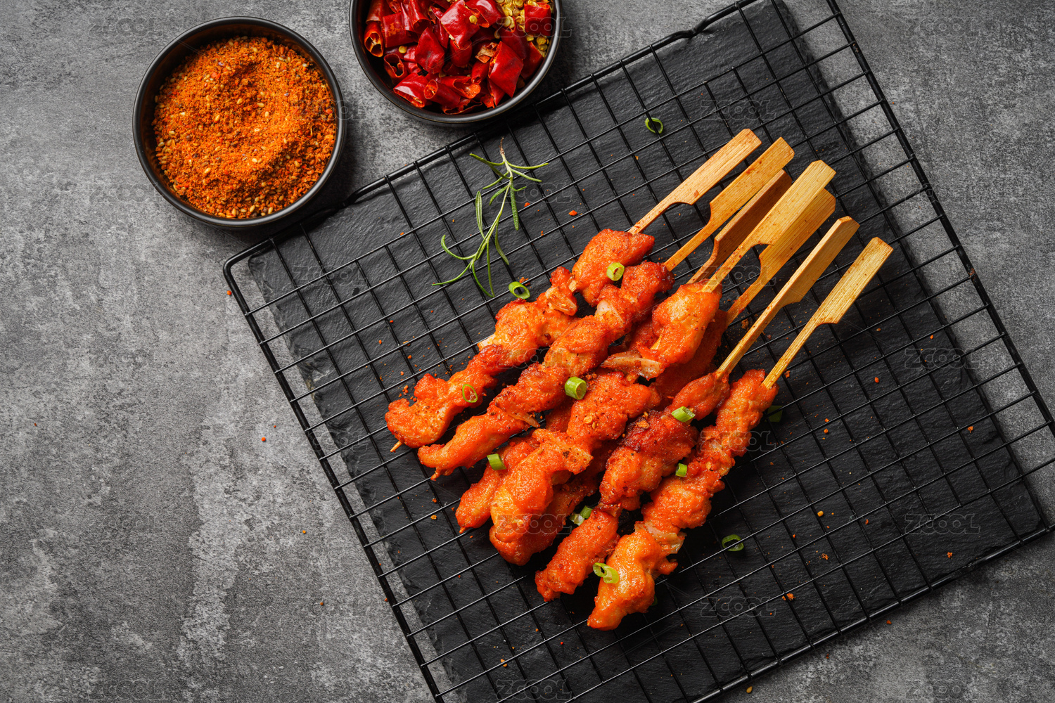黑色烤架上放着几串撒着辣椒面的油炸骨肉相连