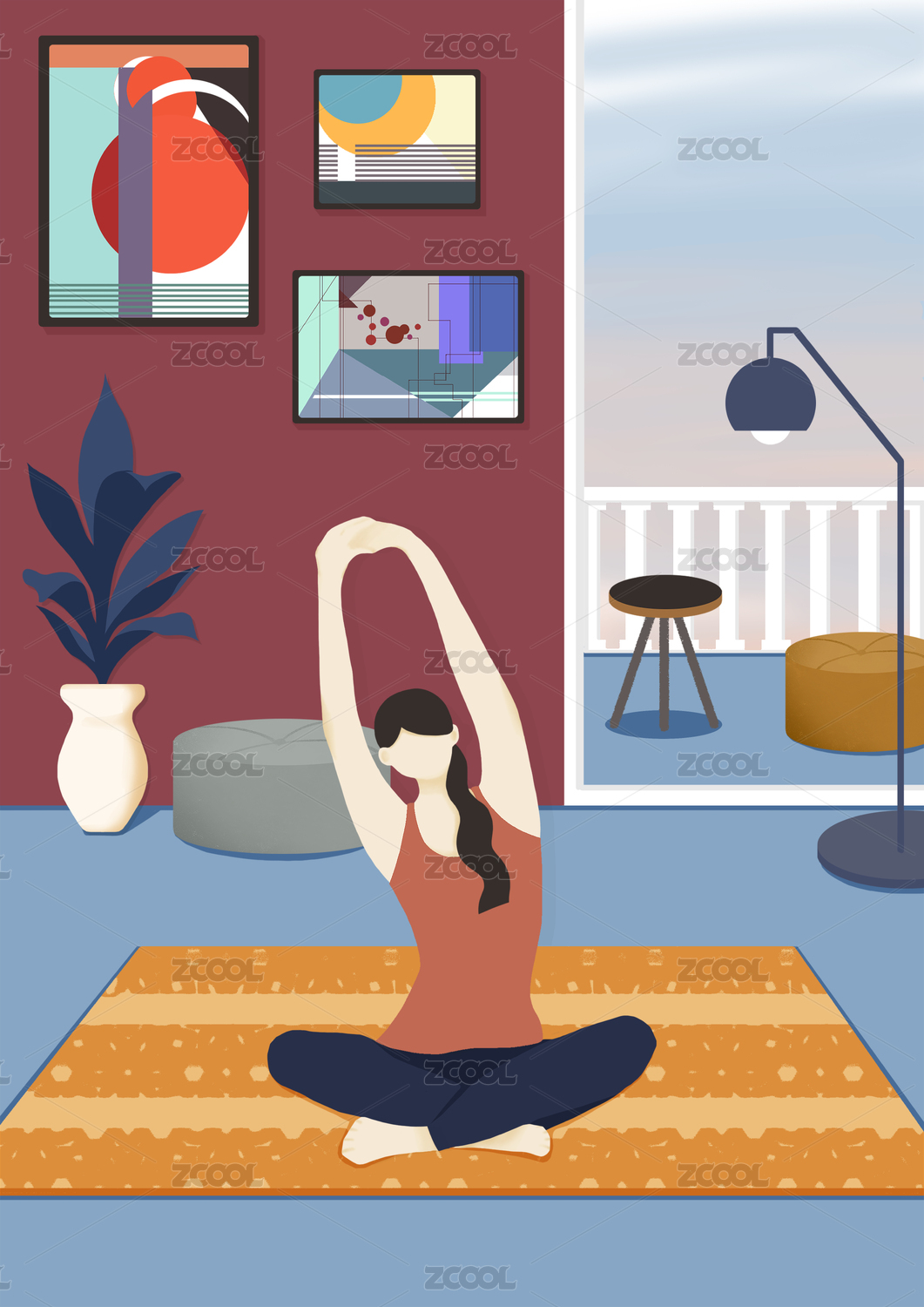 白天在室内房间中练习瑜伽的女性,运动概念插画