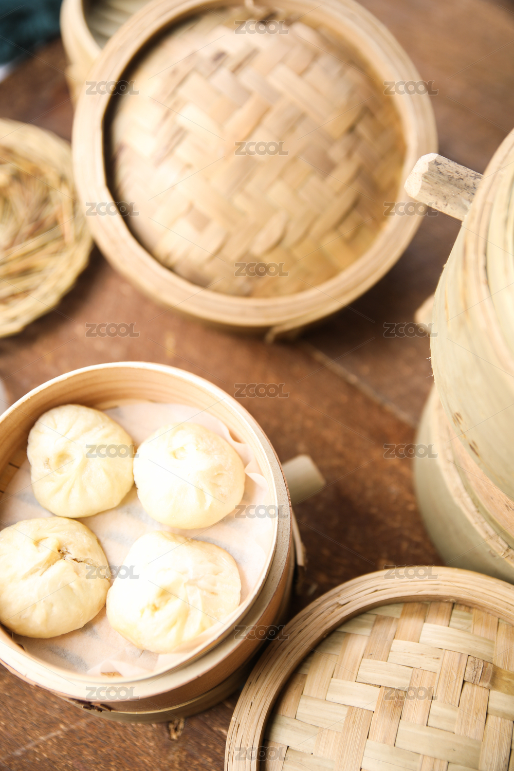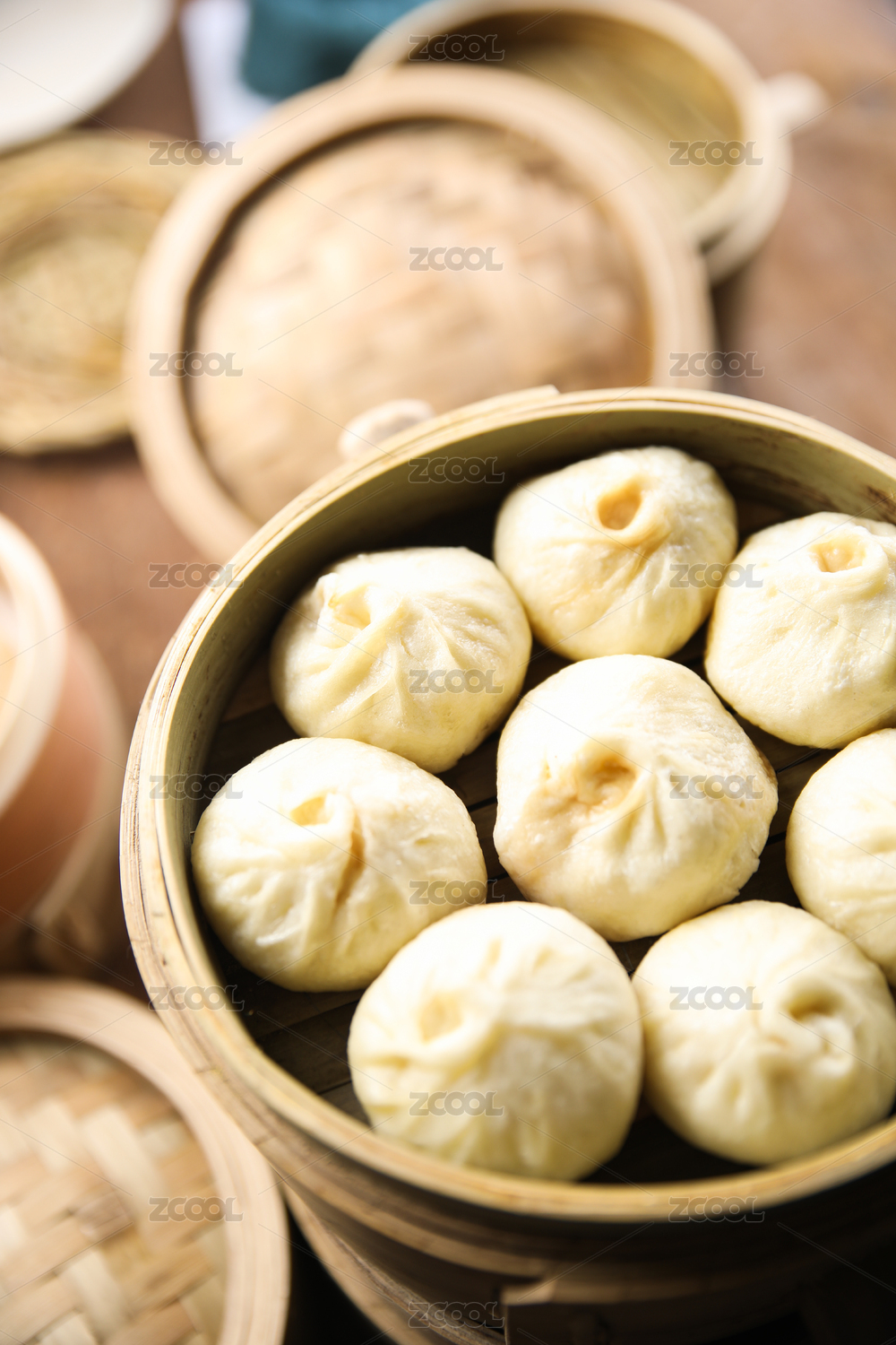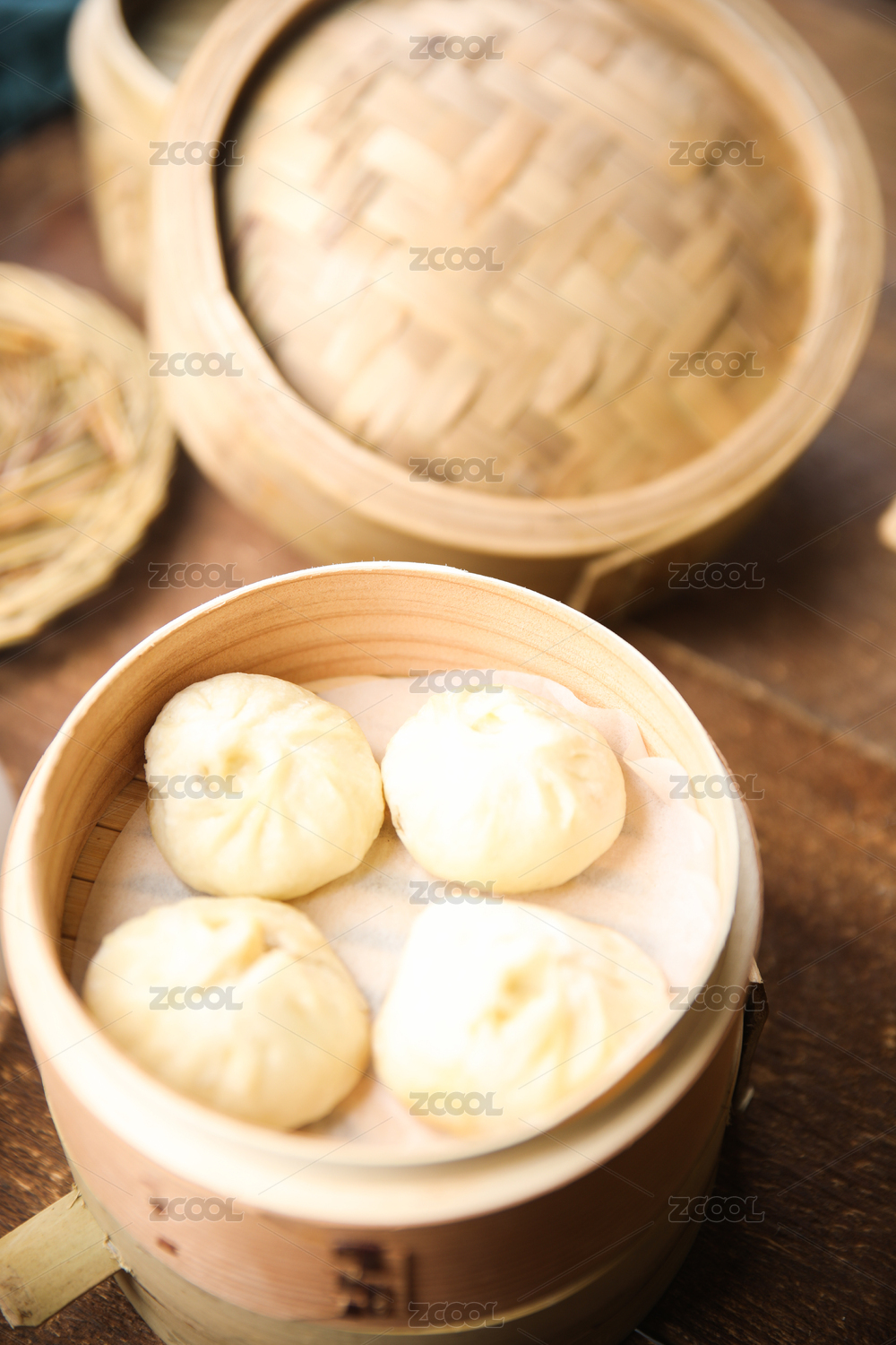 竹蒸笼上的鲜猪肉馅小包子