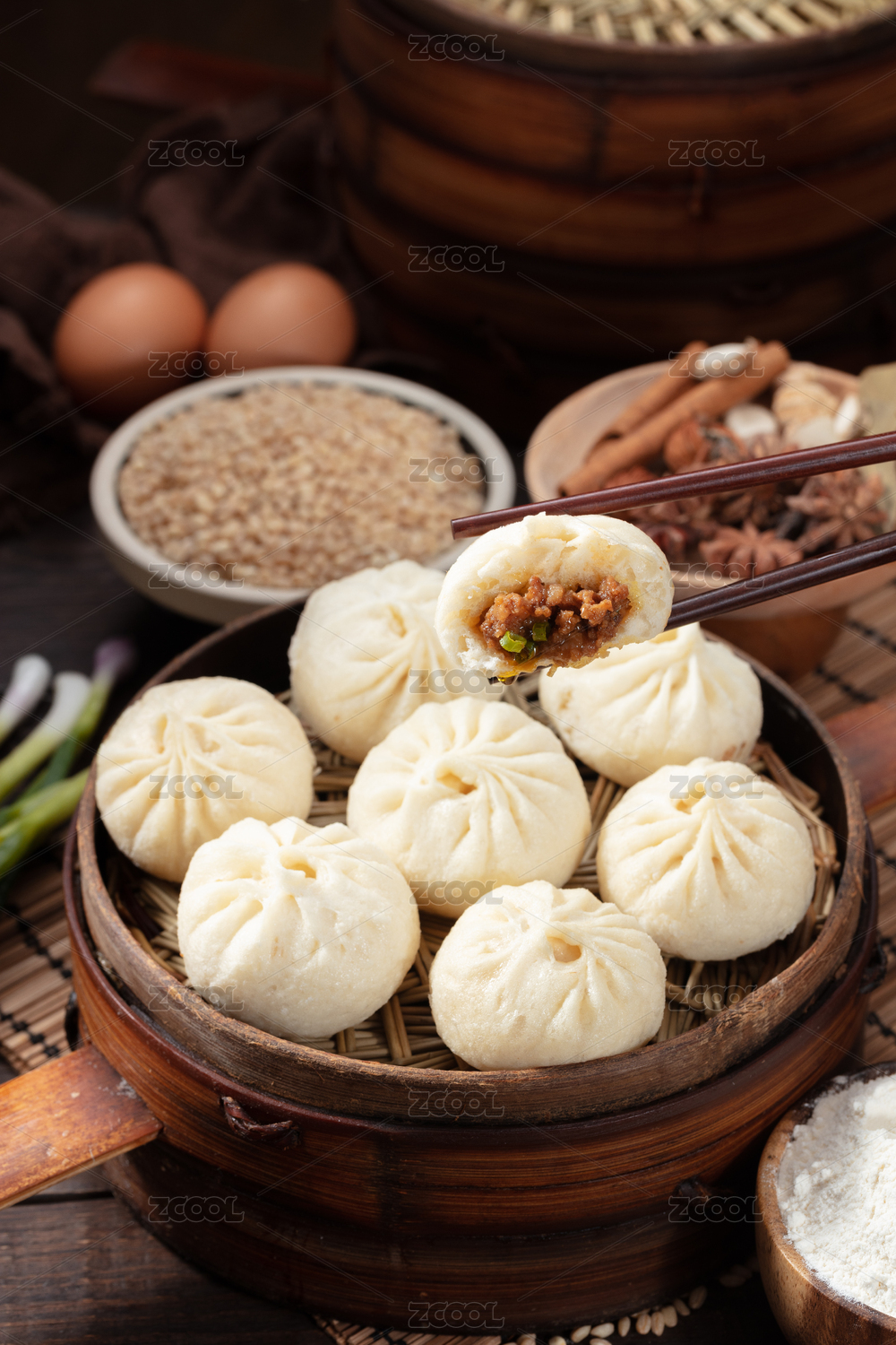 竹蒸笼上筷夹着的鲜猪肉馅小包子