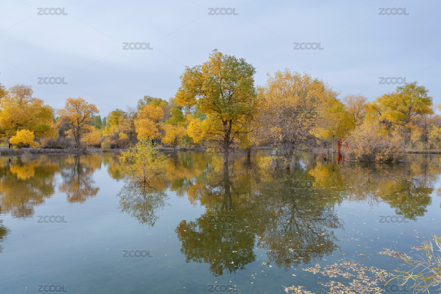 中国甘肃酒泉金塔金黄色胡杨林水面光影