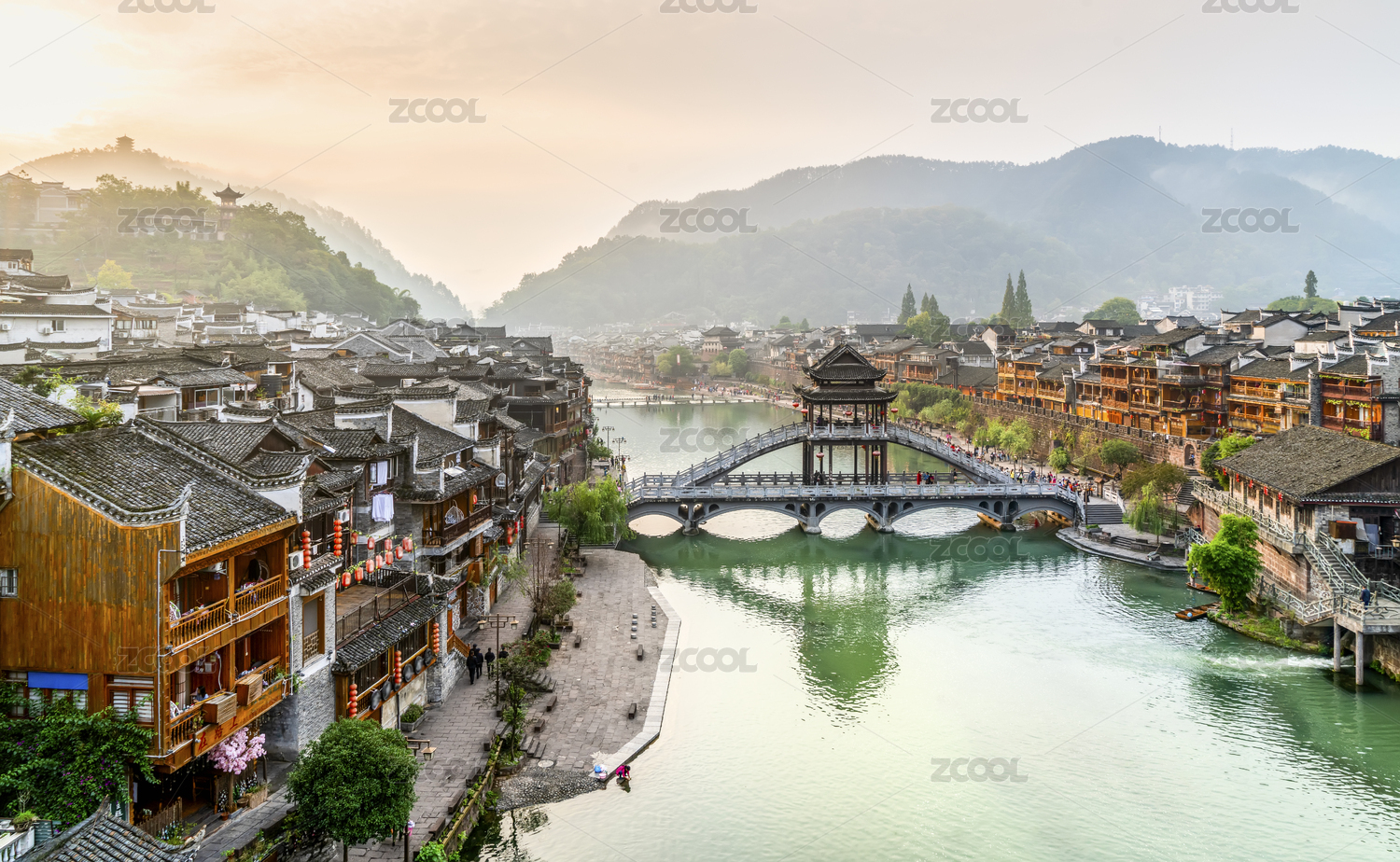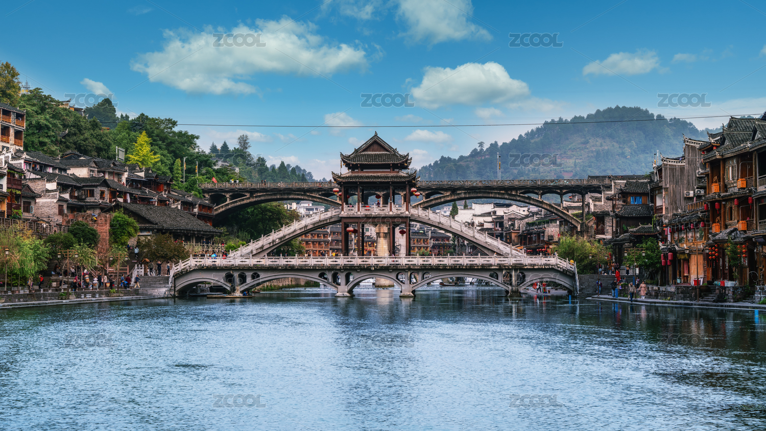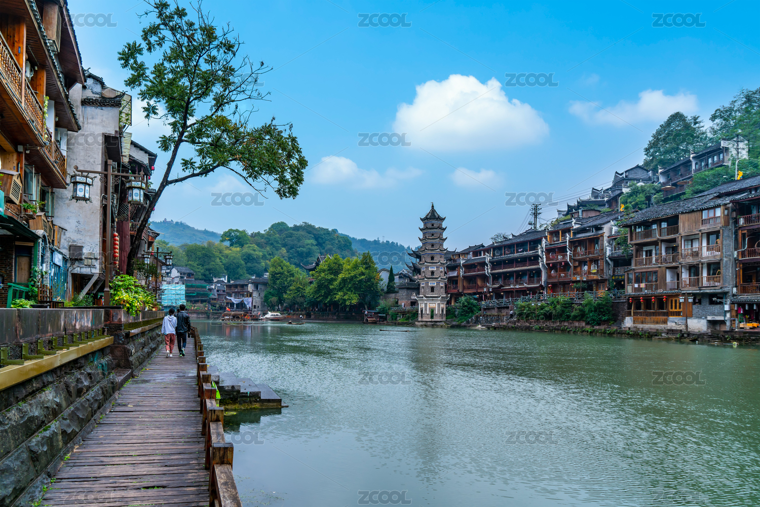 湖南湘西凤凰古城地标建筑景观——沱江及吊脚楼古建筑