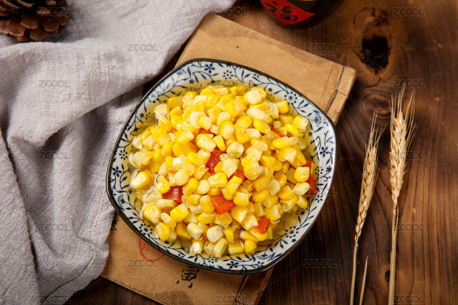 白底上放着两个带皮的包谷