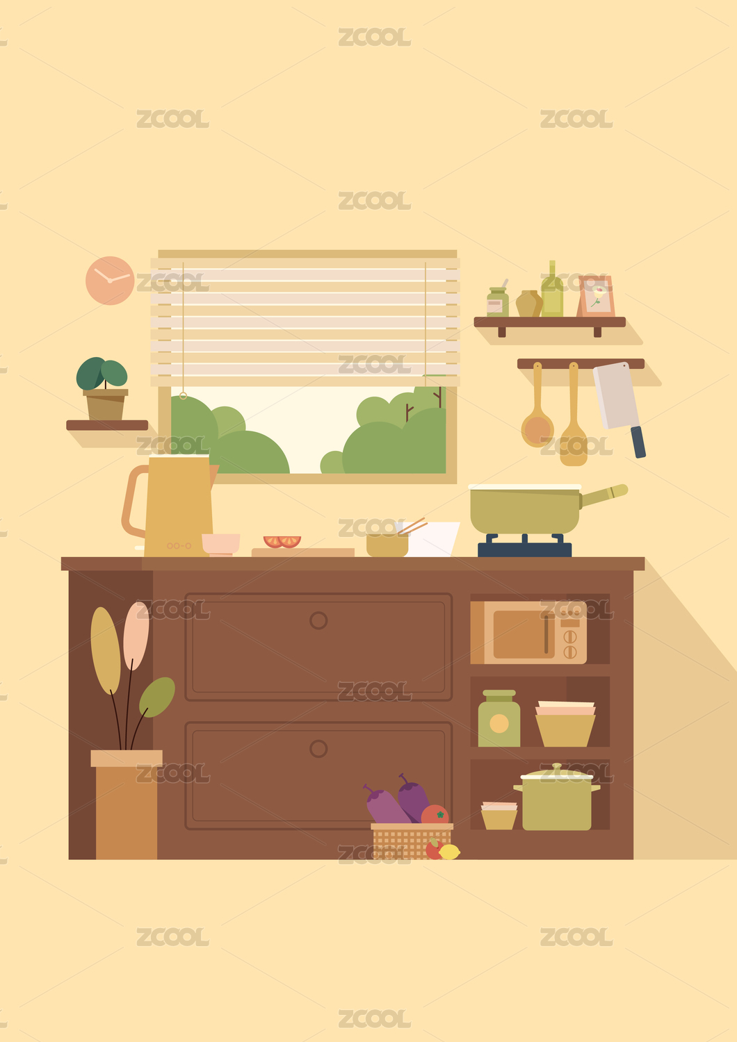 矢量扁平化厨房温馨小场景插画