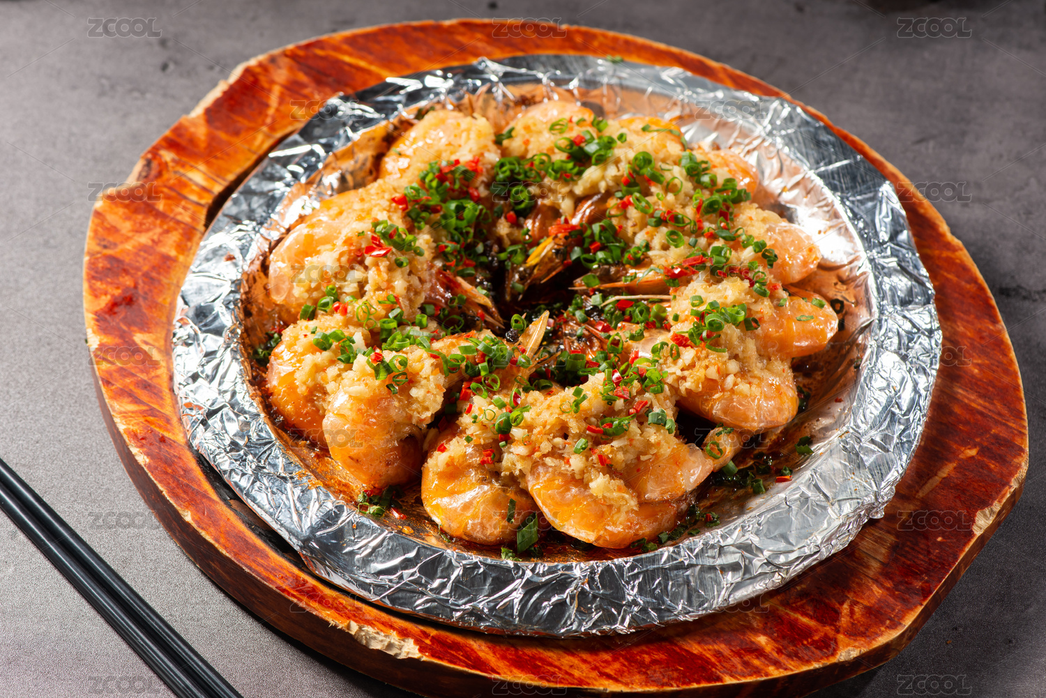 木托盘上盘子锡铂纸上冒着热气的蒜蓉虾