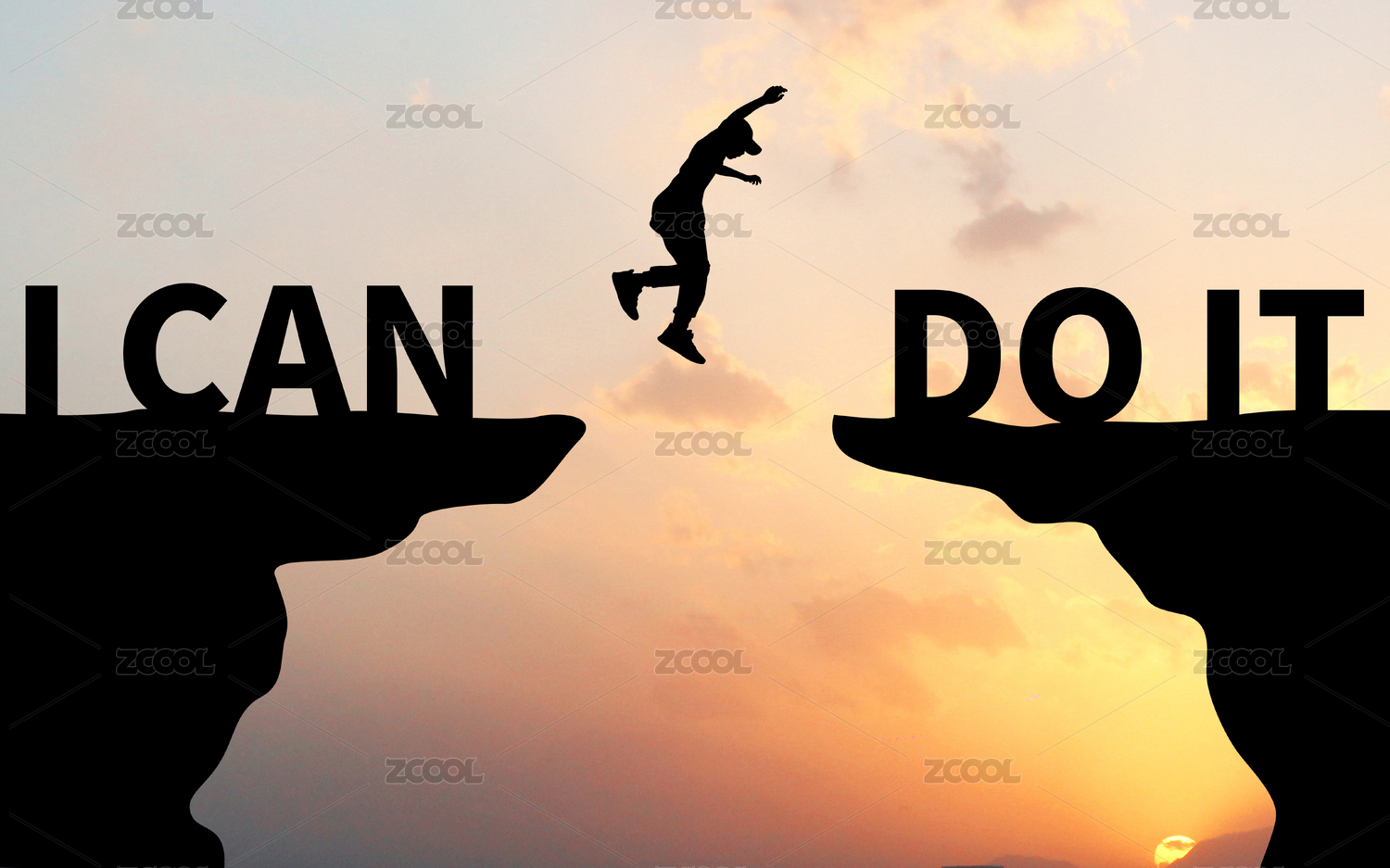 黄昏下的悬崖剪影上一个跳跃的人从I CAN 跳跃到DO IT