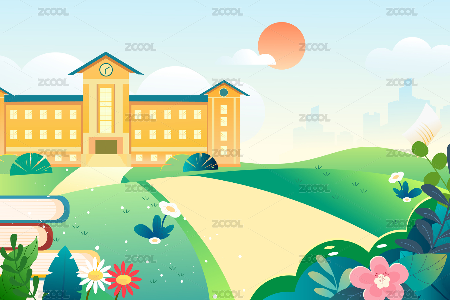 扁平卡通建筑 学校背景场地