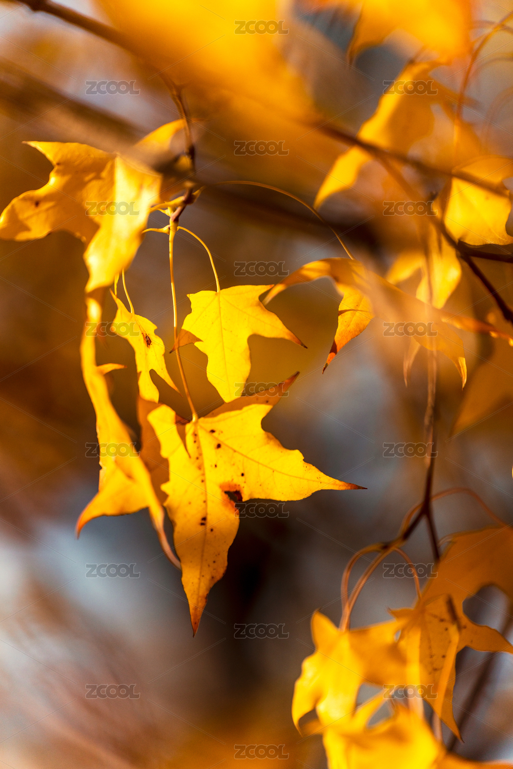 秋天阳光下枫叶黄叶特写