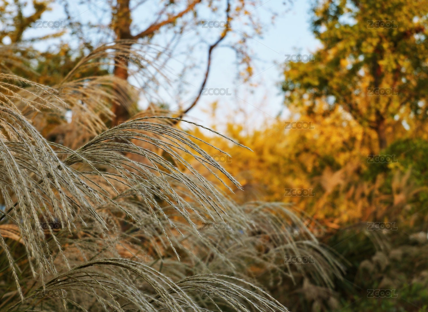 上海黄兴公园秋季黄叶背景下的芦苇