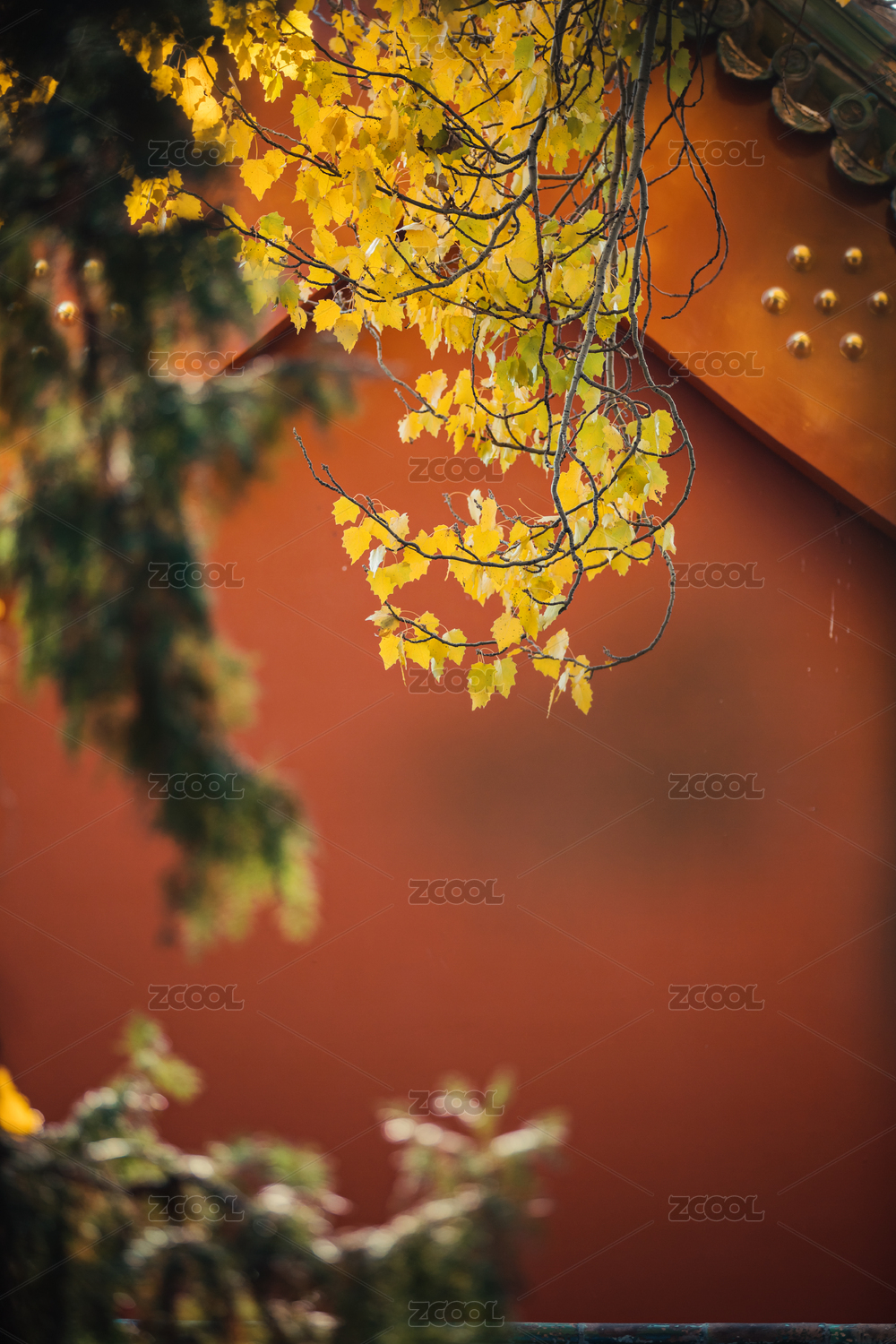 红墙绿叶和黄叶