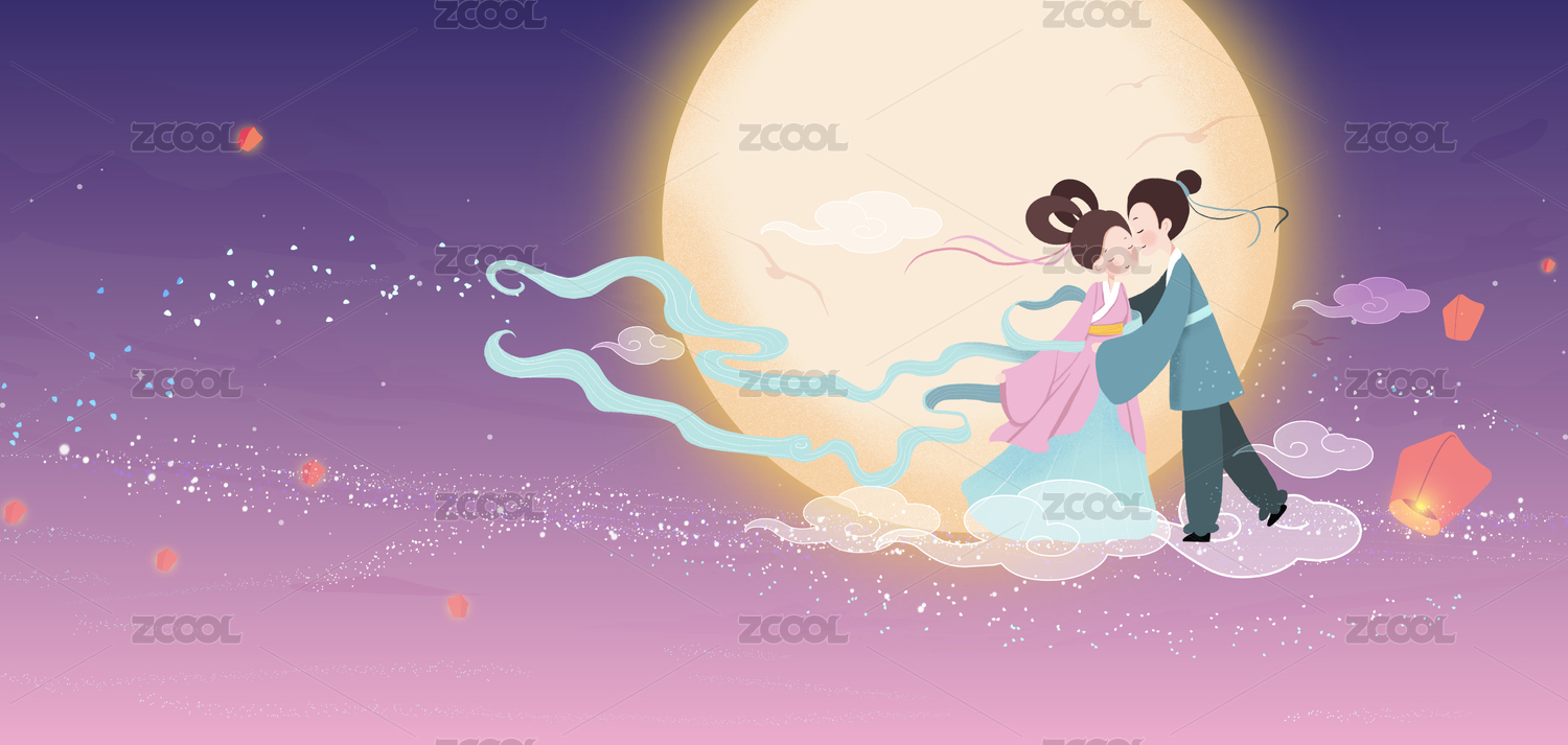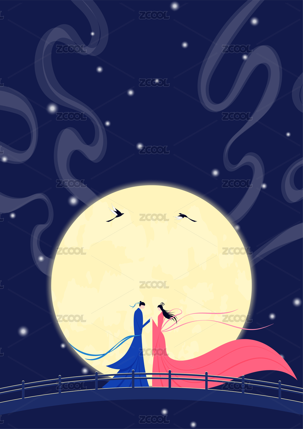 中国风七夕节在桥梁上牵手赏月的牛郎织女