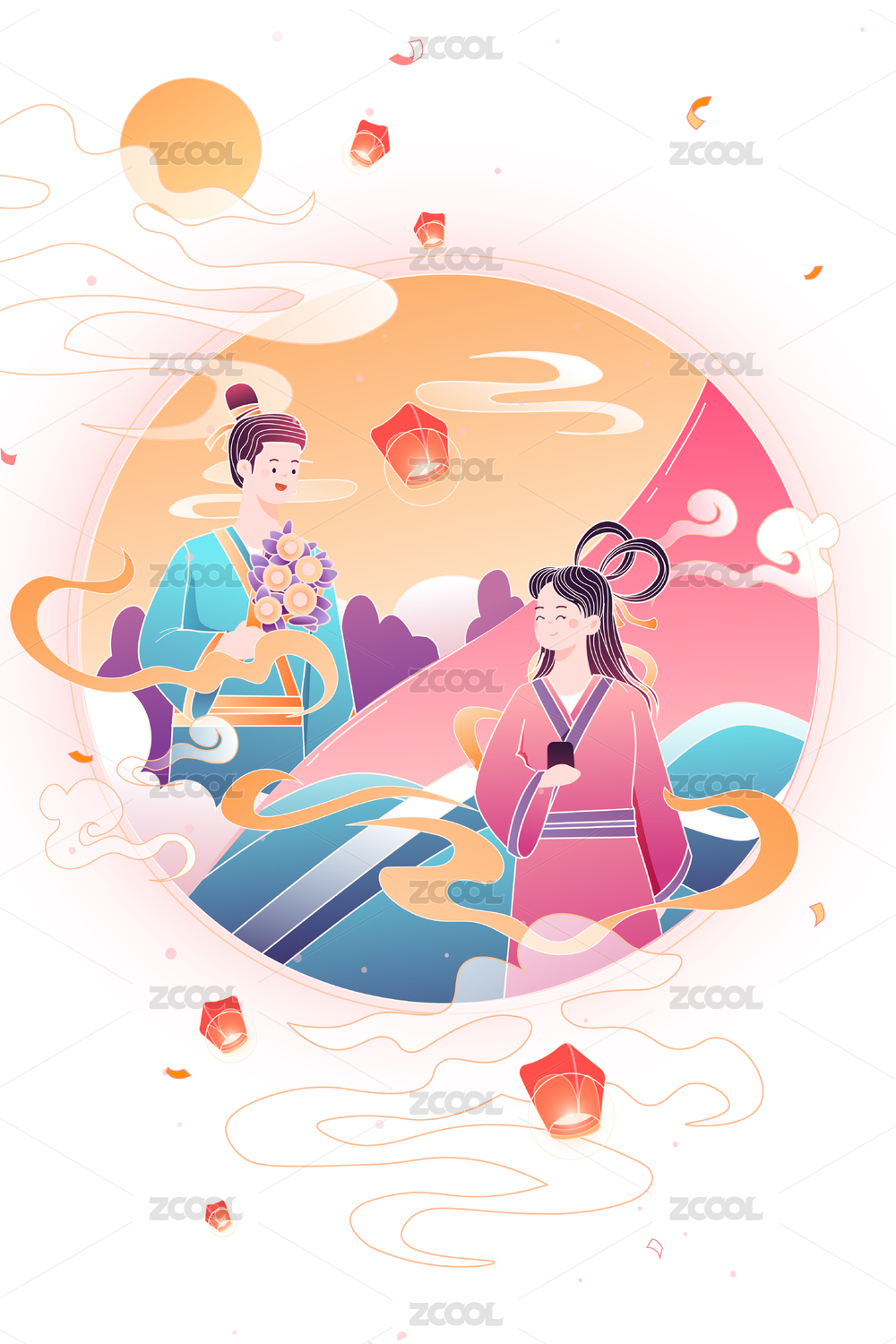 【分层可编辑】浪漫七夕竖版海报古风牛郎织女氛围插画