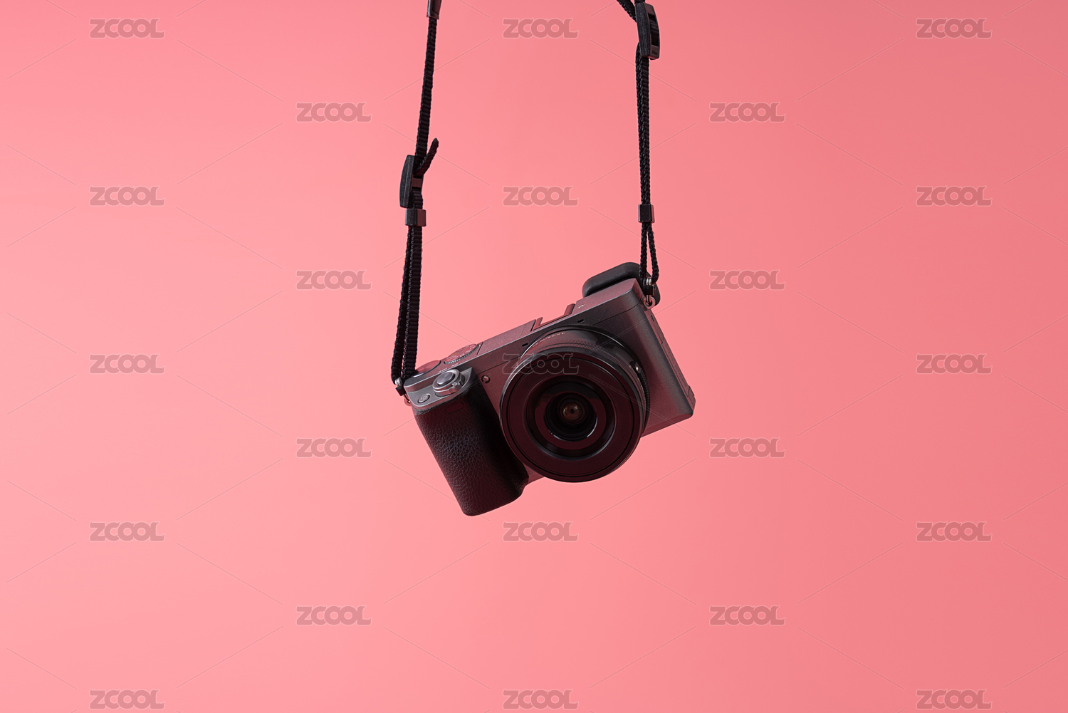 悬挂在粉色背景前的微单小相机