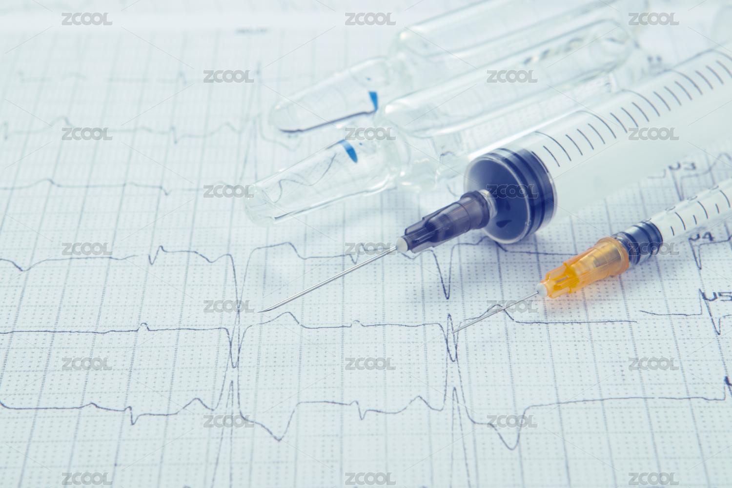 检测单上的心电图和注射器