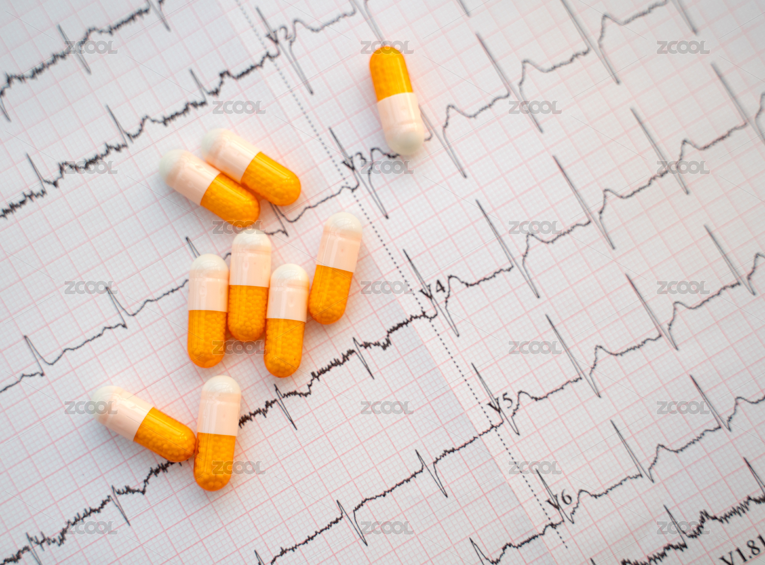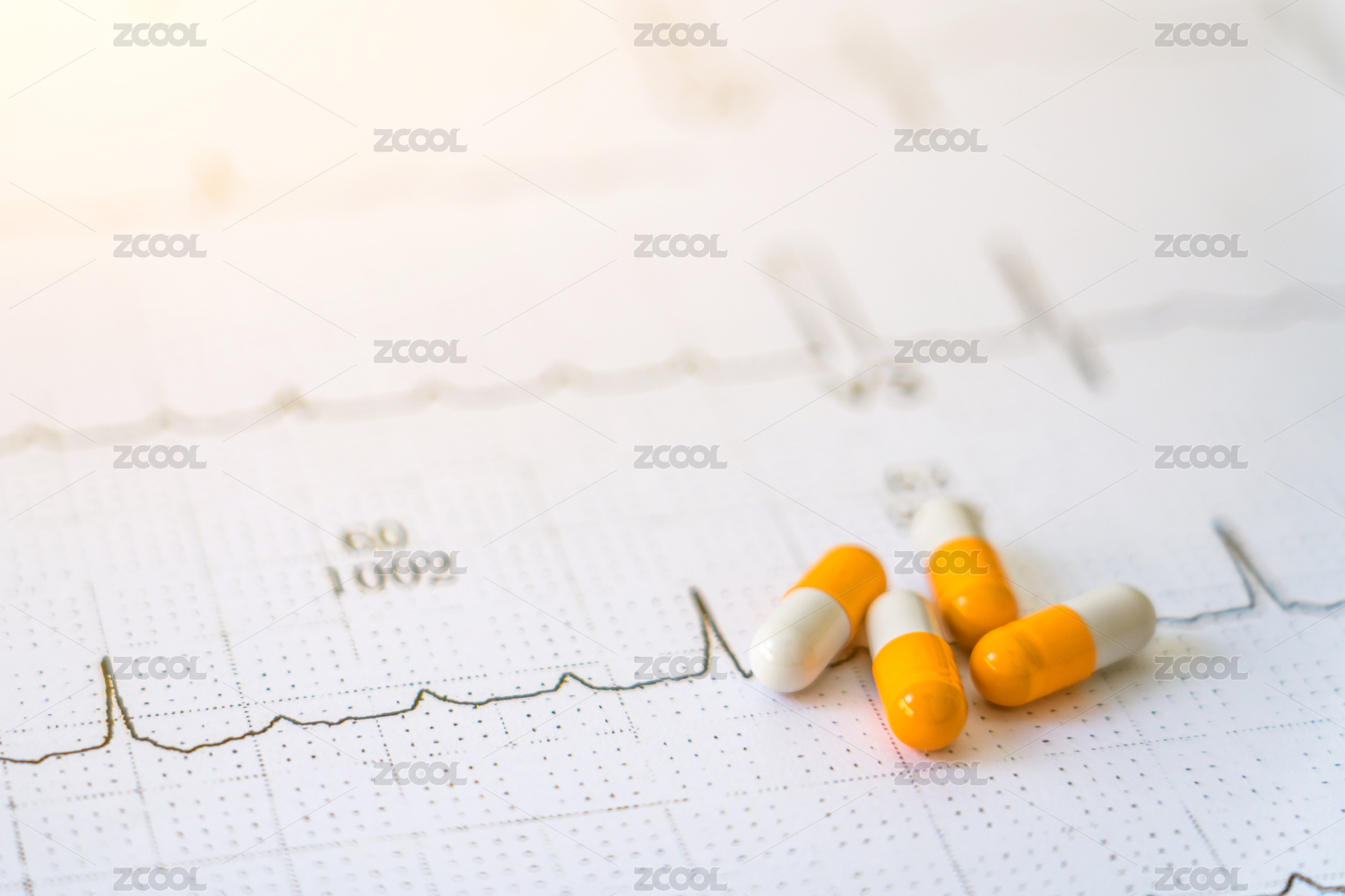 几粒胶囊药物放在心电图图纸上