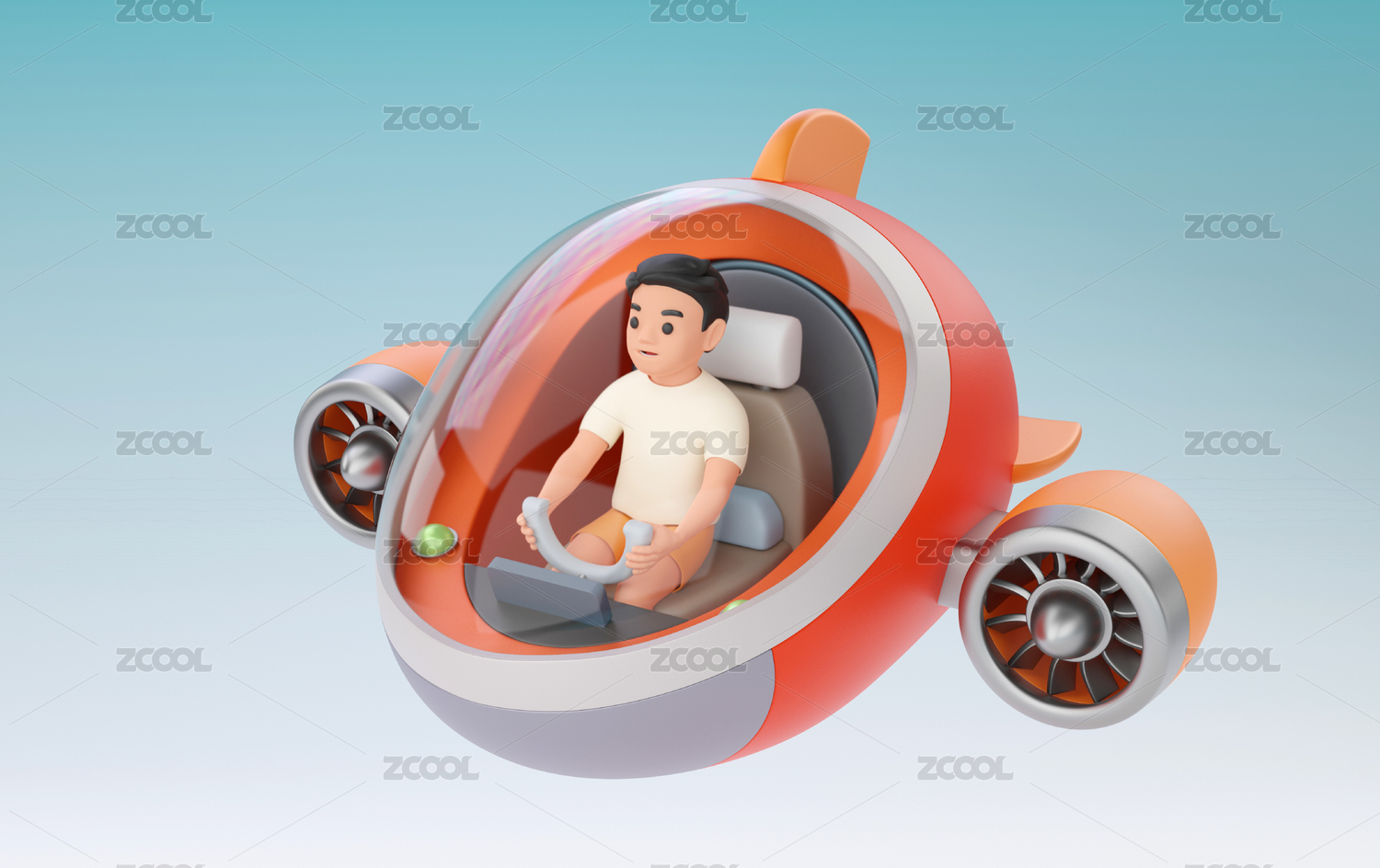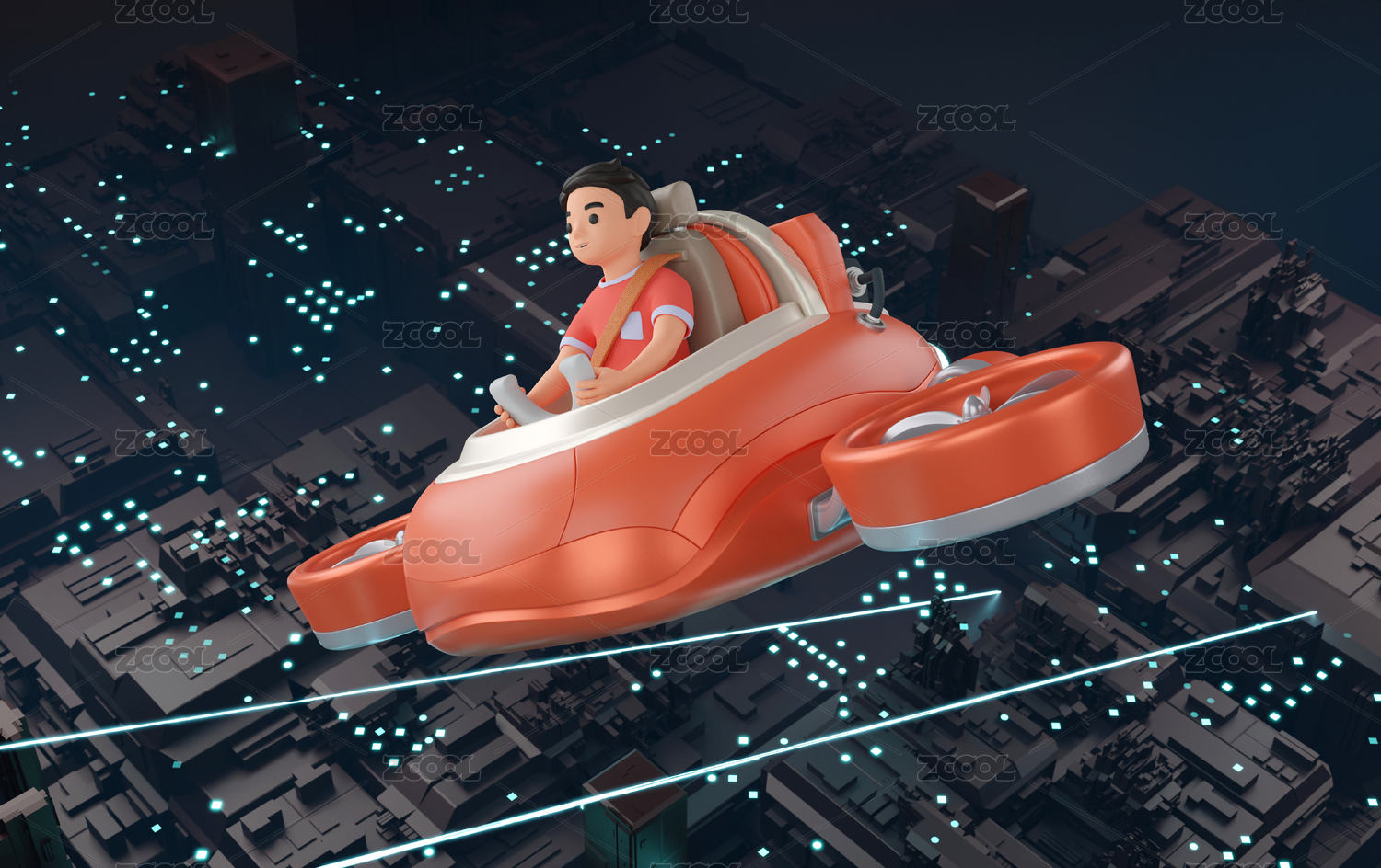 男孩驾驶橙色飞船穿梭在光影的城市建筑中