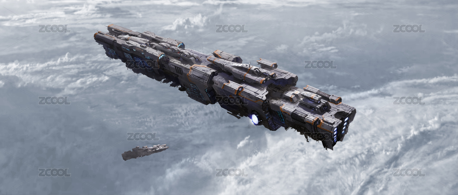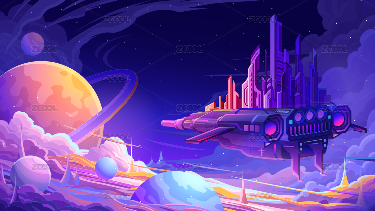 紫色科幻太空科技行星星球悬浮前进宇宙飞船