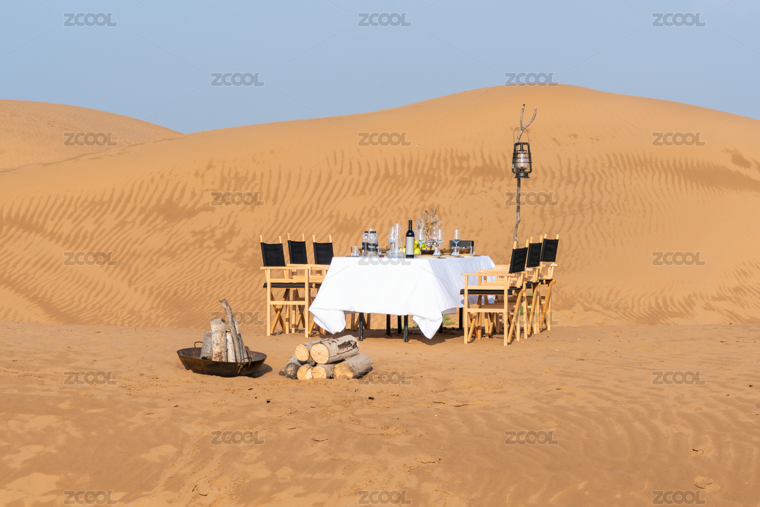 金黄色沙漠中的白色桌布的长条餐桌上的各种美食和木质餐椅