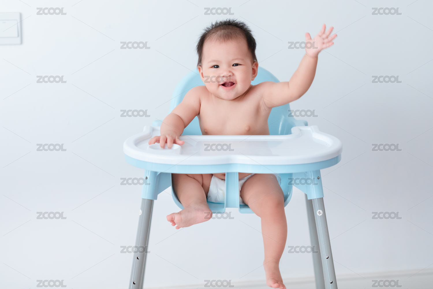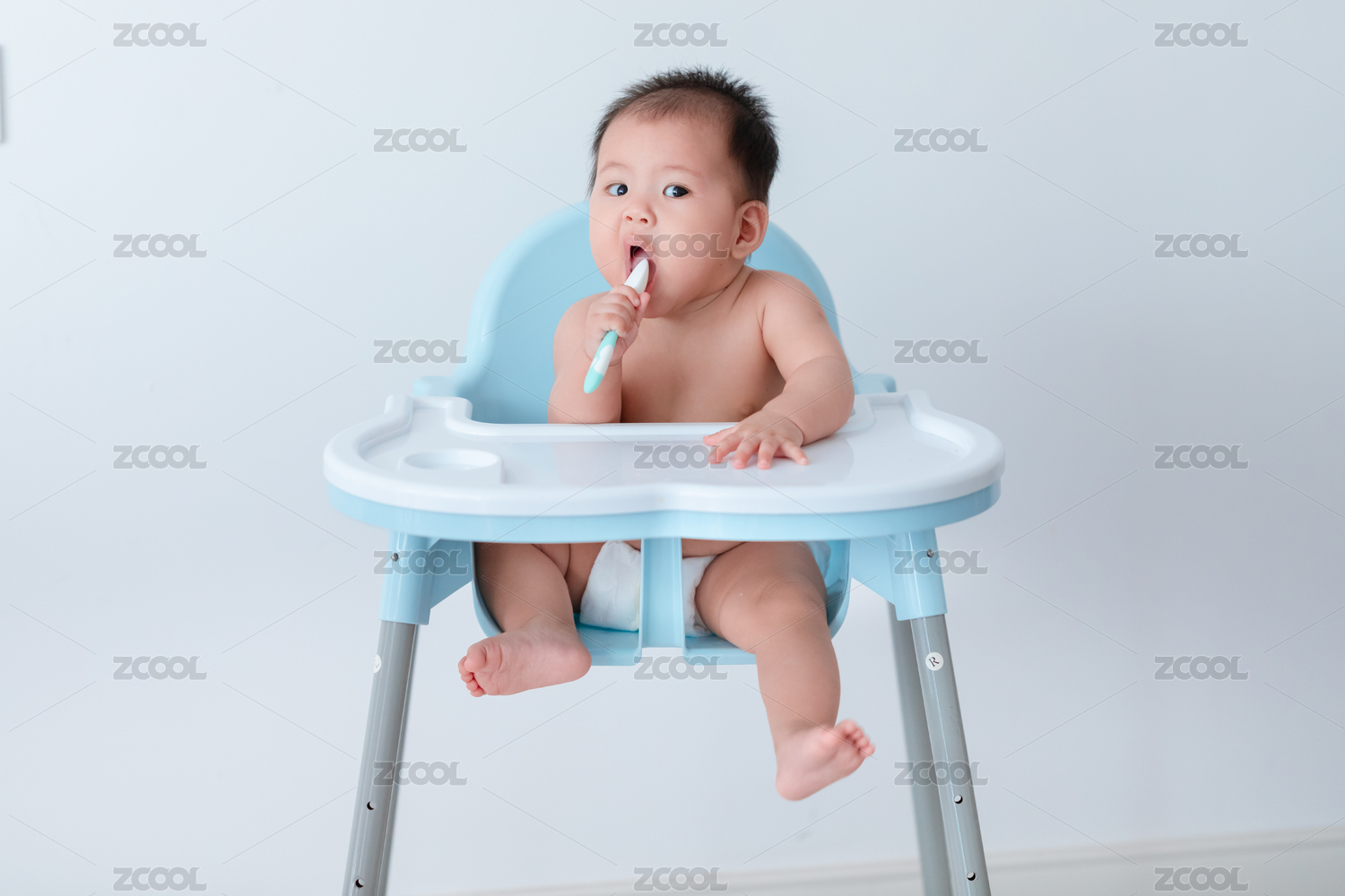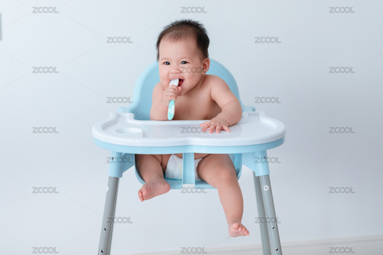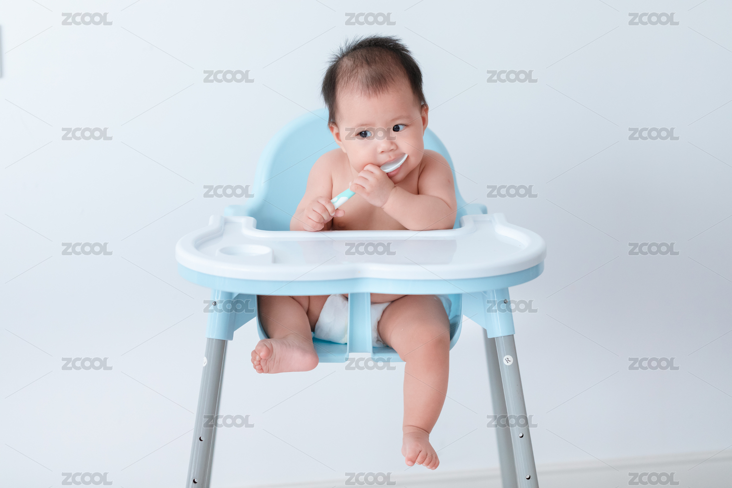 6个月大的宝宝在蓝色餐椅上玩勺子