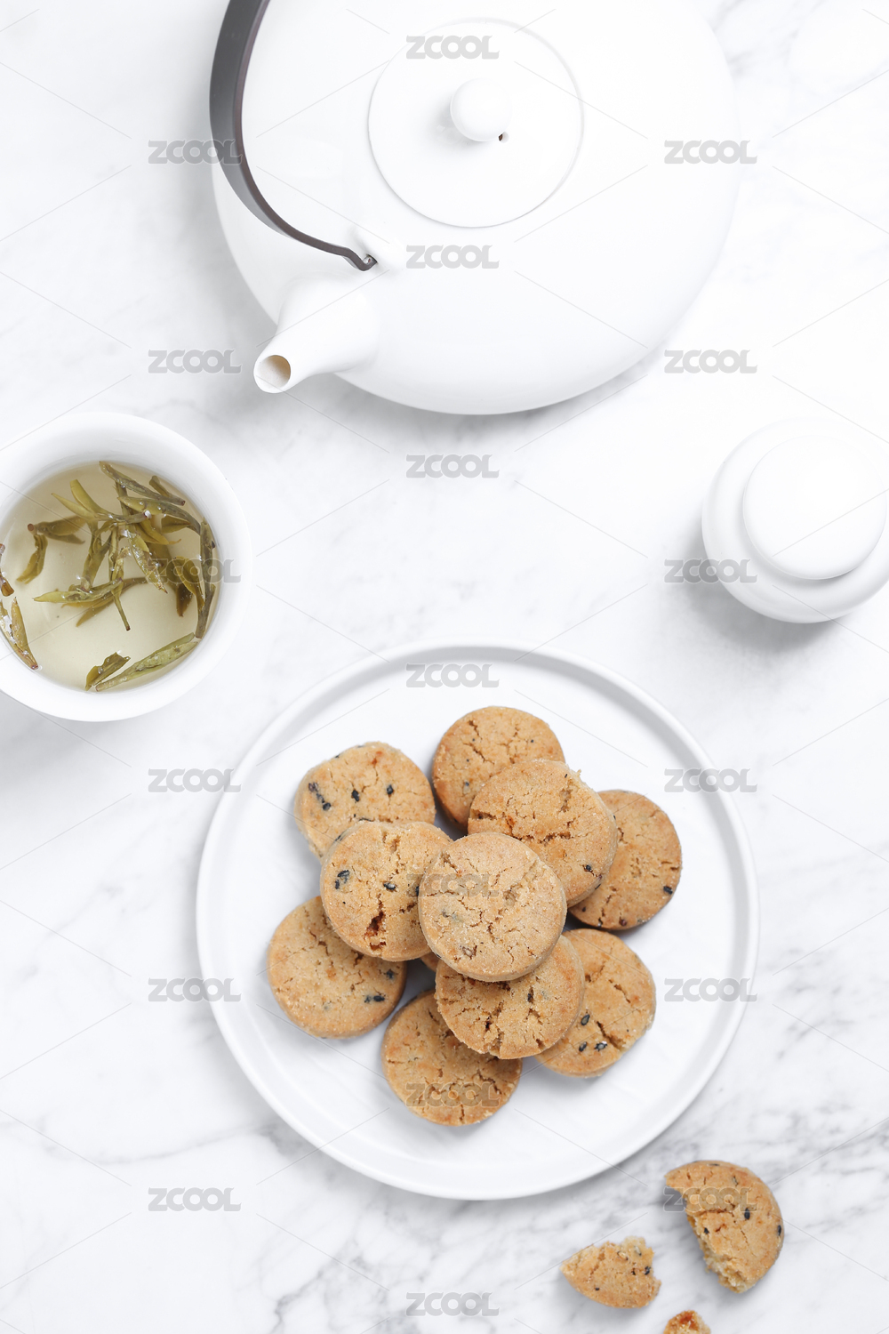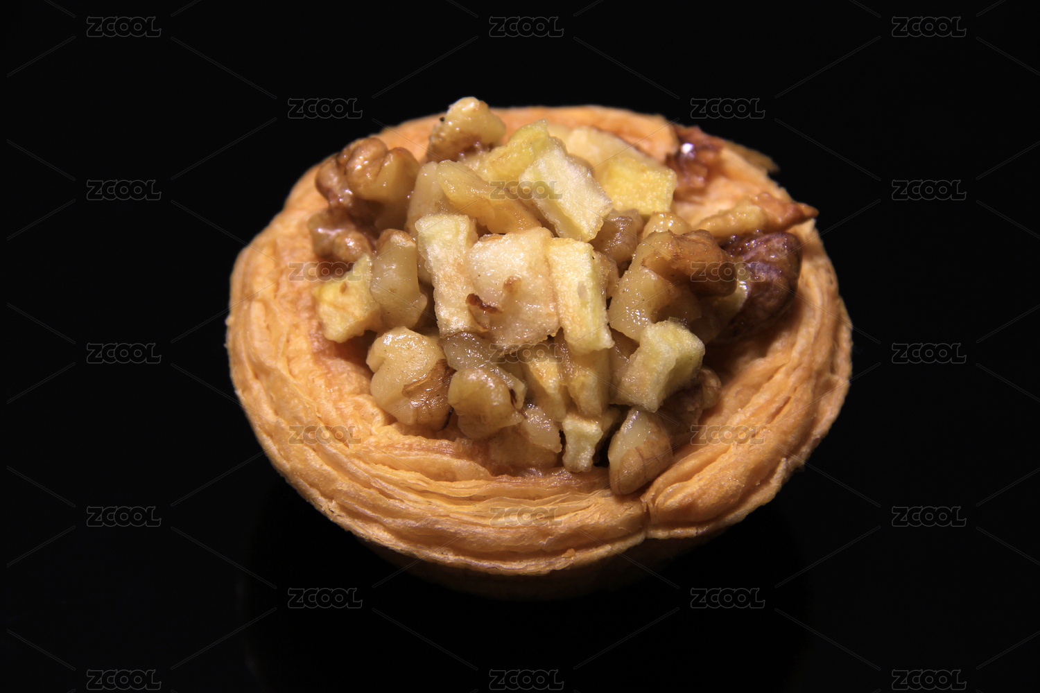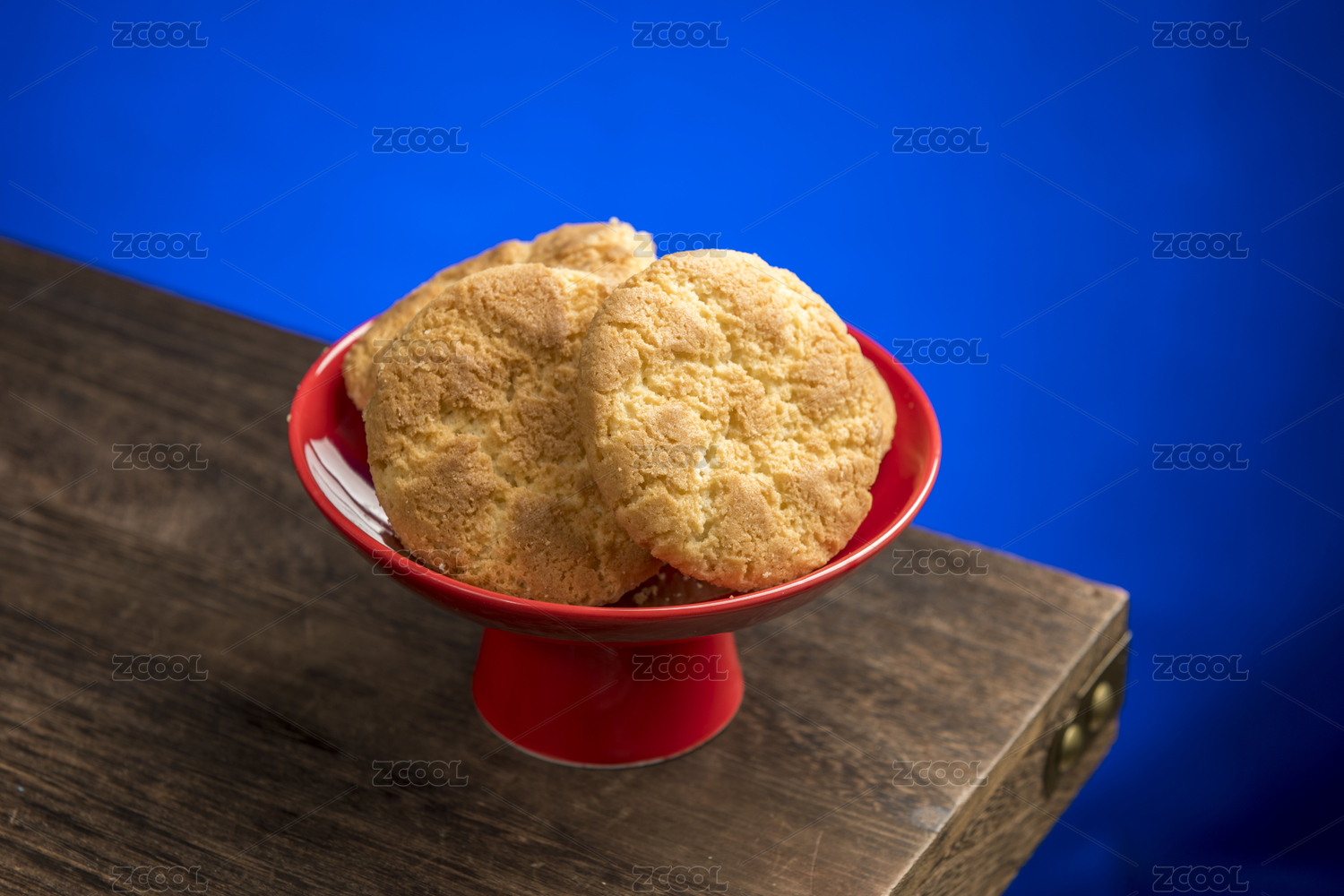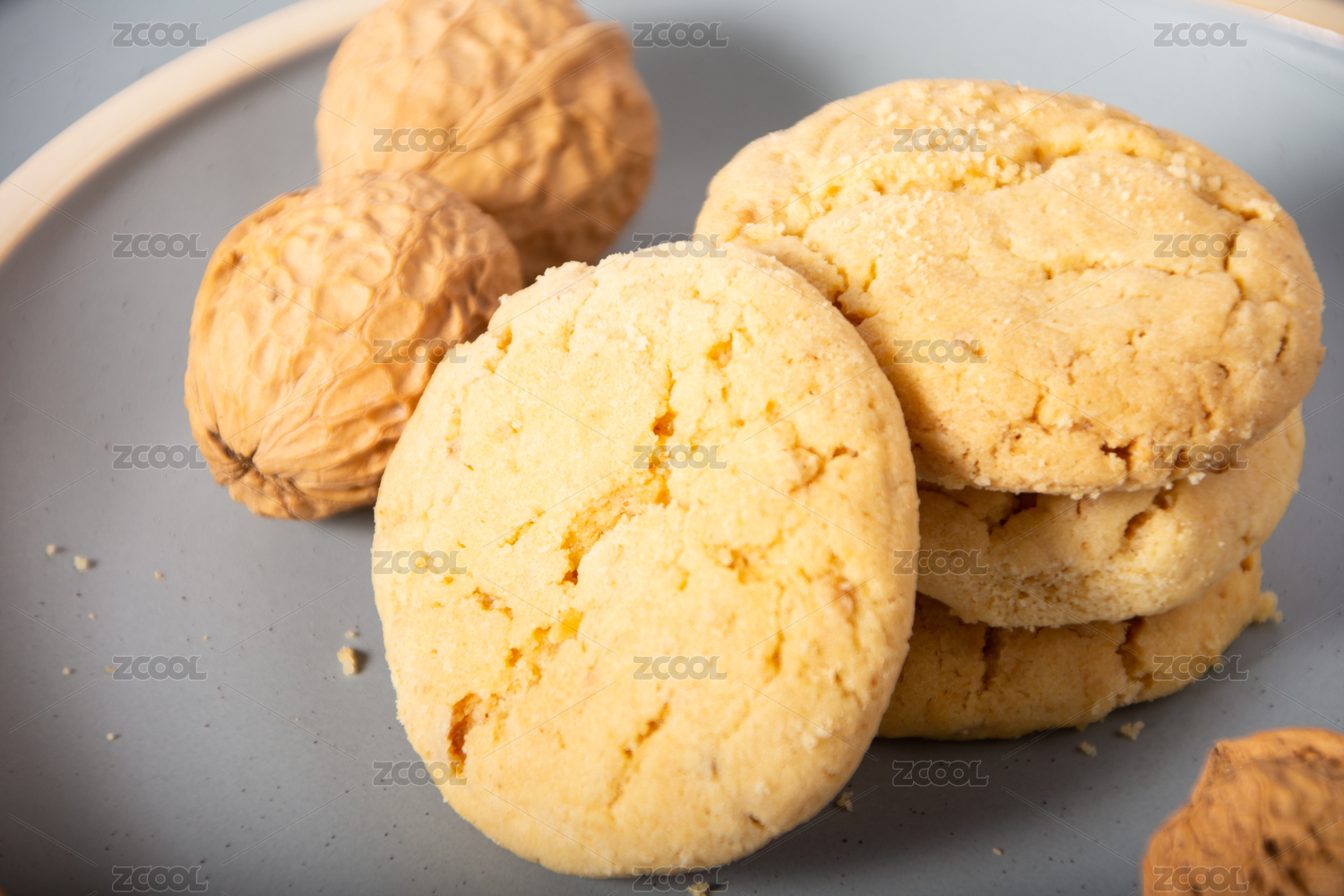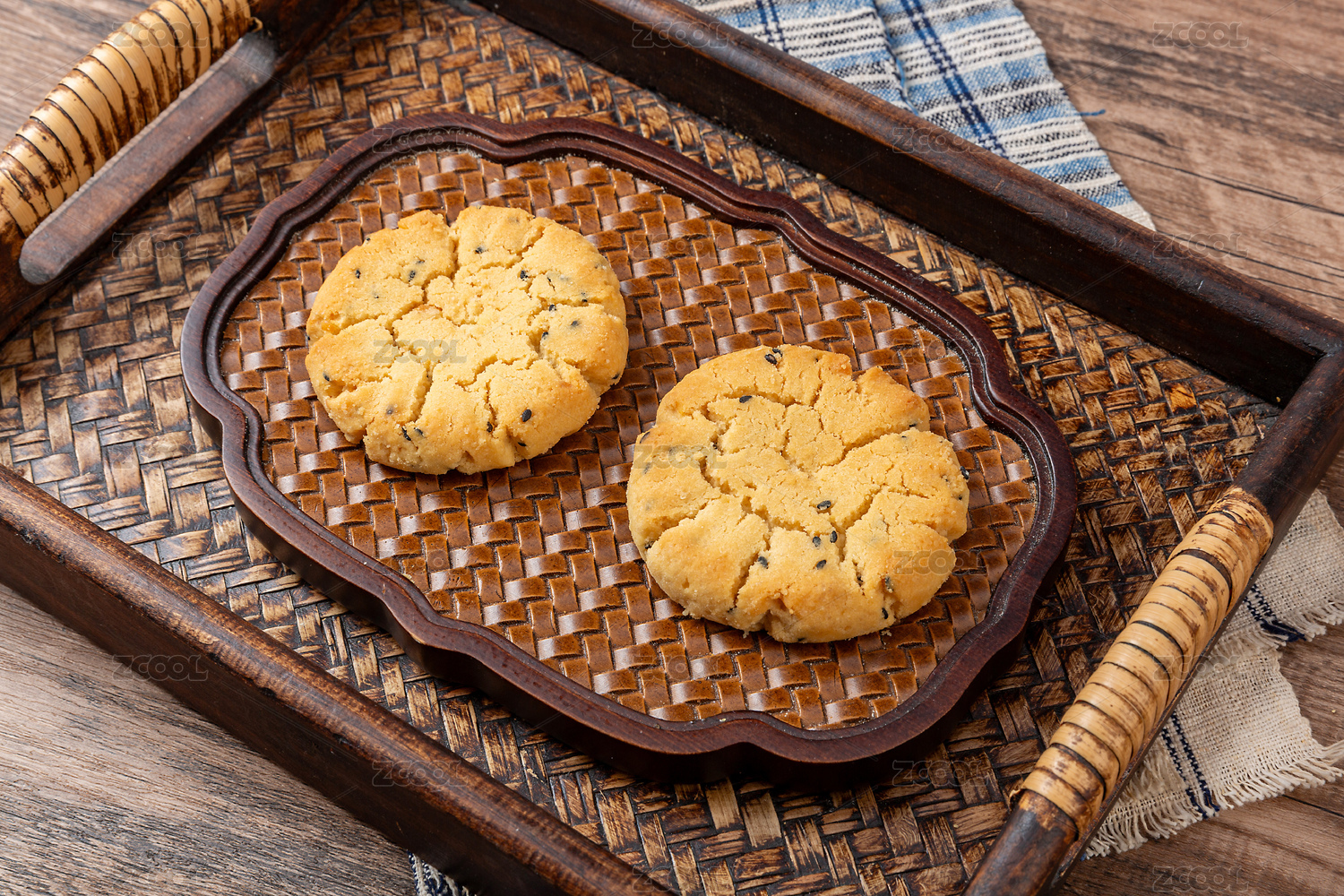 阳光下放在竹编桌子上的中式传统糕点核桃酥
