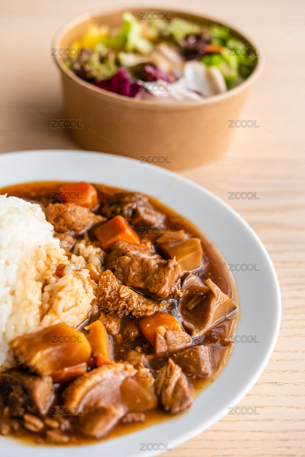 一盘红烧牛肉饭配生菜紫甘蓝沙拉